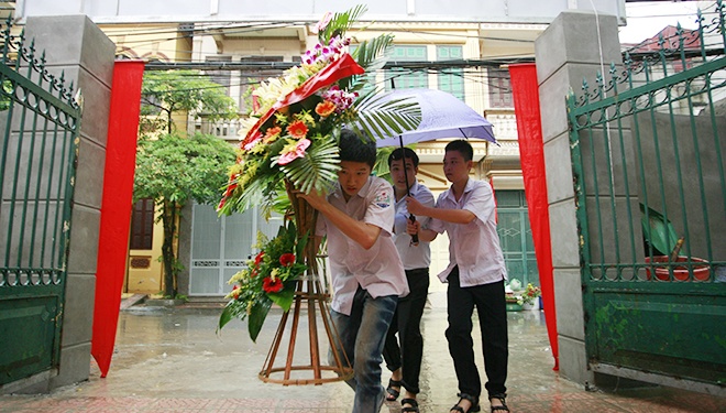 Học sinh cấp 2 bê lẵng hoa lên sân khấu trong cơn mưa kéo dài hàng tiếng đồng hồ.