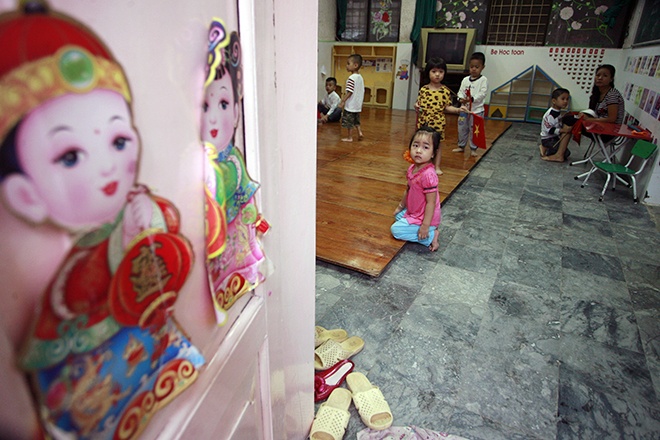 Những bé đến sớm được đưa vào trong lớp học để tránh mưa. Các em tranh thủ lên bảng viết chữ và nghịch đùa.