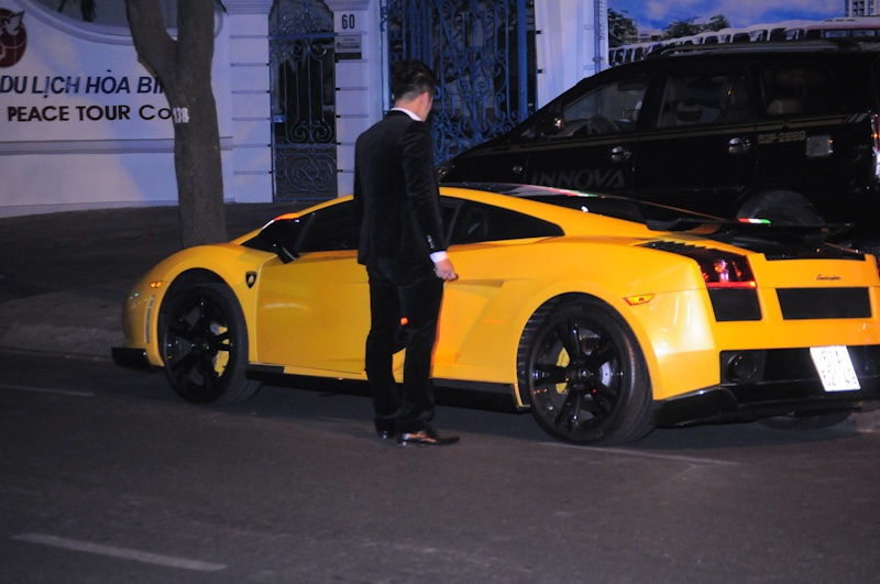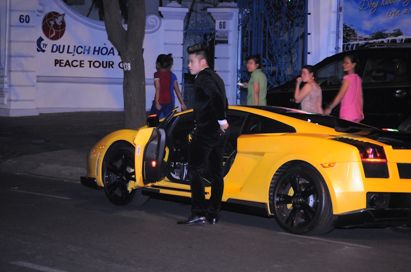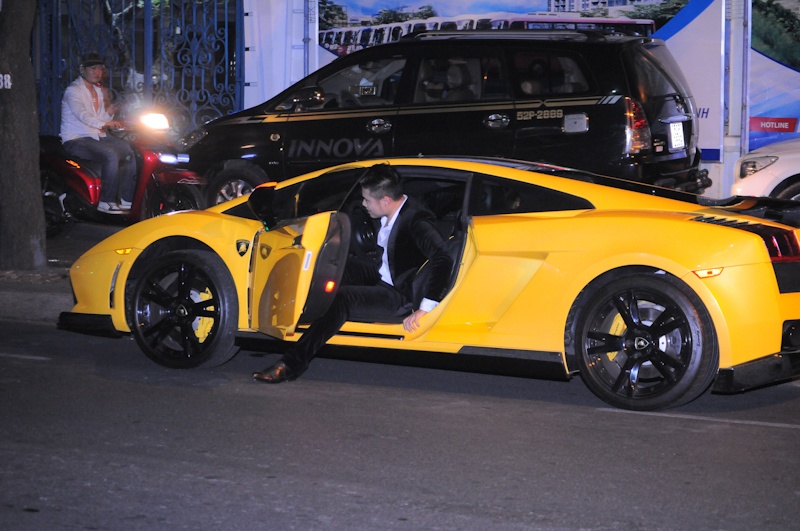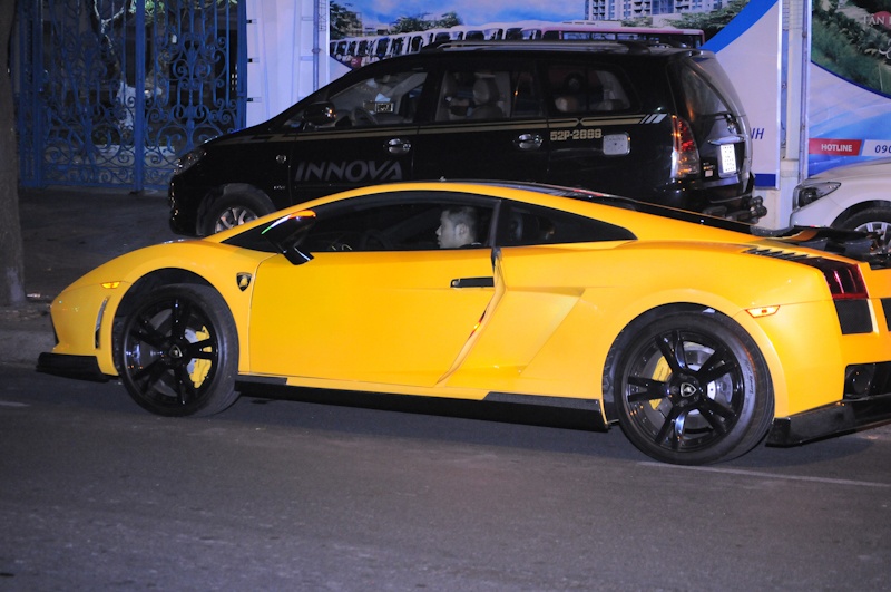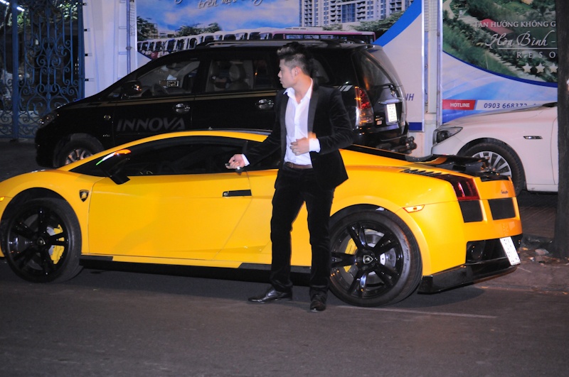 | Ngọc Minh lái siêu xe hai cửa Lamborghini màu vàng đến điểm diễn, thu hút nhiều sự quan tâm của những người hâm mộ. |