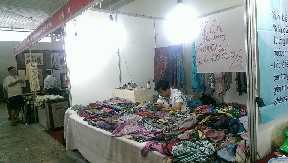 Cách đó không xa là gian hàng bán khăn lụa, khăn mùi xoa rất ít người ghé vào mua. Tại đây, mỗi sản phẩm có giá 100.000-150.000 đồng. Chủ hàng tên Phương cho biết, các năm trước, thời điểm này mặt hàng khăn lụa bán rất chạy. Thế nhưng, năm nay thời tiết nắng nóng, kinh tế khó khăn, khách mua ít. Doanh thu mỗi ngày chưa nổi 1,5 triệu đồng.