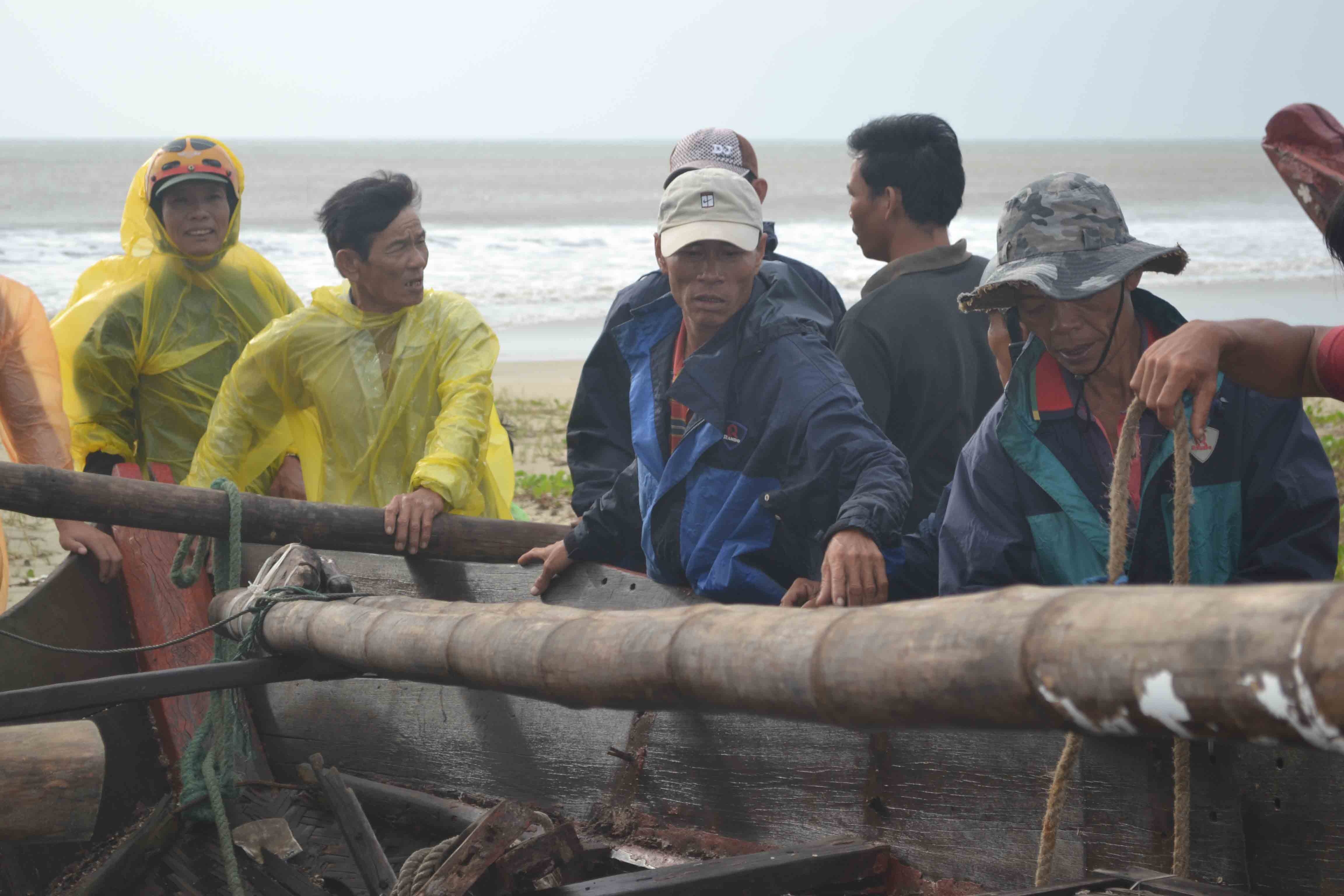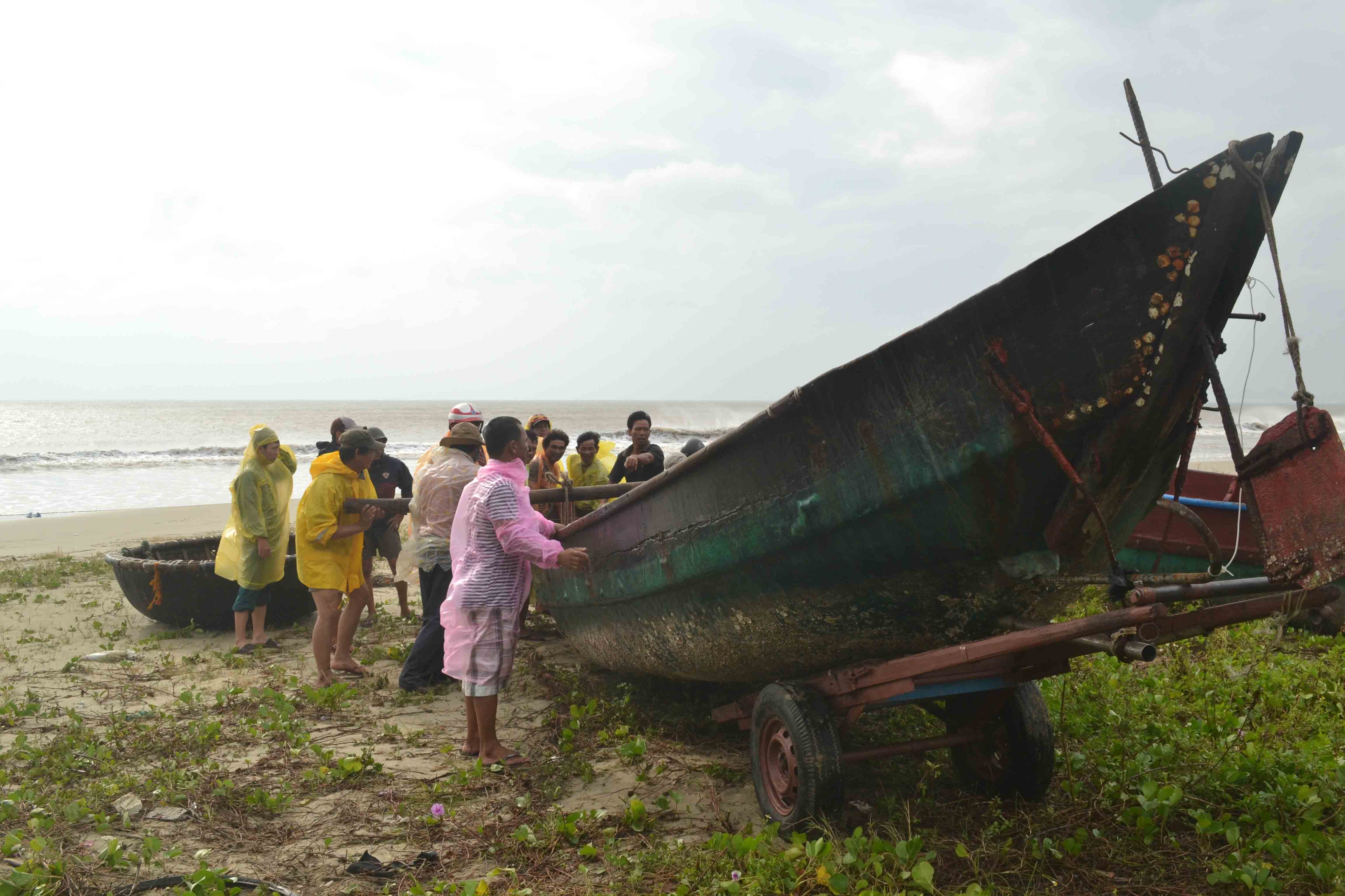 | Ngư dân Quảng Ngãi khiêng thúng vào nơi an toàn để tránh bão. |