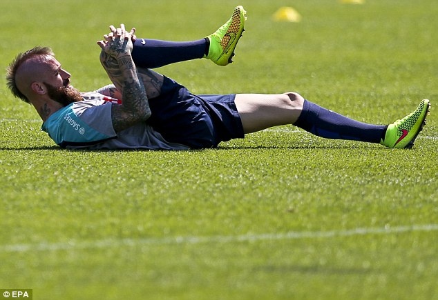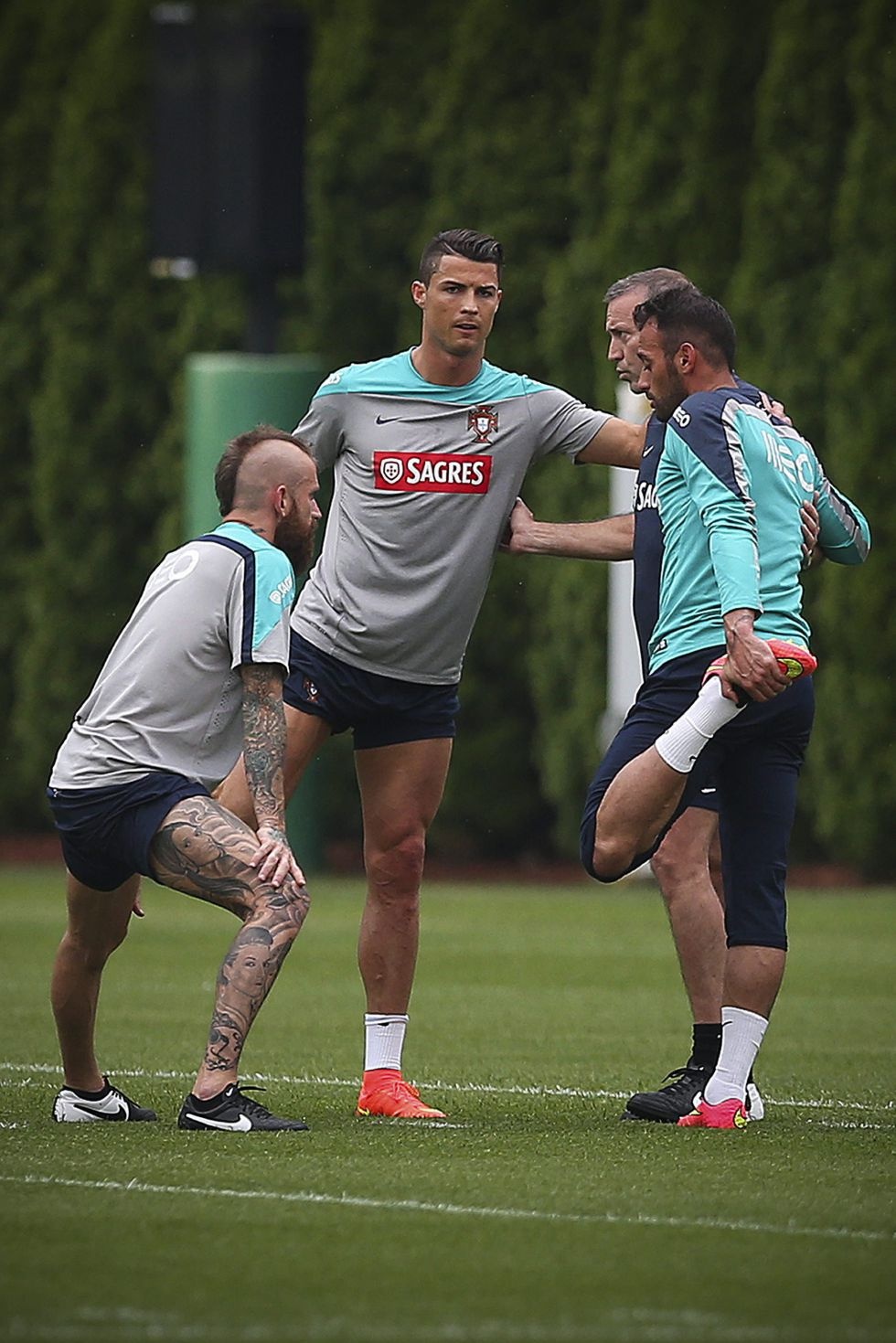 | Ronaldo tập cùng các đồng đội cũng như HLV thể lực của tuyển Bồ Đào Nha. CR7 phải vật lộn với chấn thương khi thi đấu cho Real Madrid mùa trước. HLV Paulo Bento trước đó cũng không thể xác định mốc thời gian cụ thể anh có thể quay lại thi đấu. |