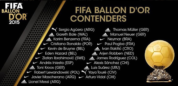 | Danh sách đề cử ứng viên cho danh hiệu Quả bóng vàng FIFA 2015. Ảnh: FIFA. |