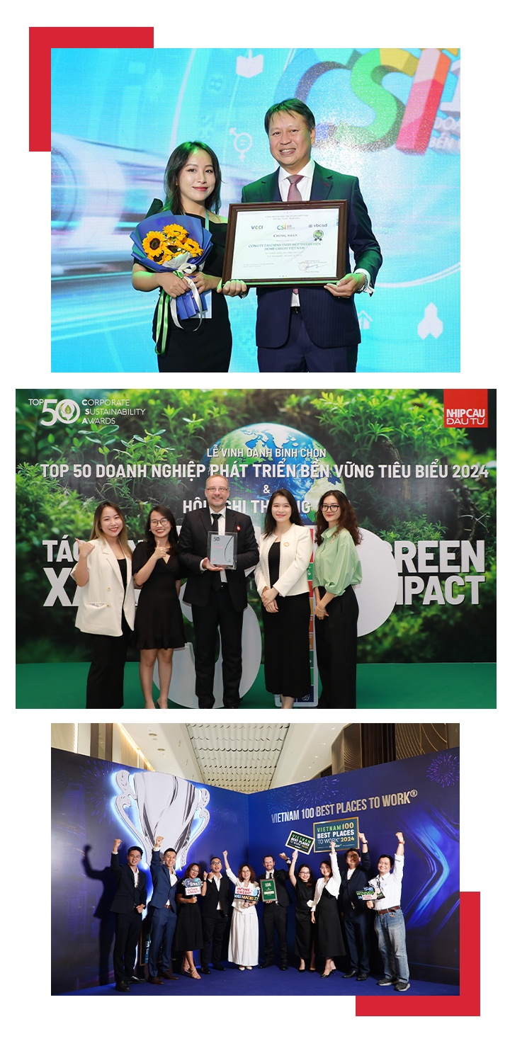 Với những nỗ lực để hiện thực hóa các chiến lược phát triển bền vững, Home Credit trở thành công ty tài chính tiêu dùng duy nhất có 4 lần liên tiếp được vinh danh tại Giải thưởng Doanh nghiệp tiên phong Phát triển bền vững và Trách nhiệm xã hội Toàn cầu (Global CSR & ESG Leadership Award); 3 năm liền lọt Top 100 Doanh nghiệp Bền vững tại Việt Nam do Liên đoàn Thương mại và Công nghiệp Việt Nam (VCCI) trao tặng; 2 lần có tên trong danh sách 50 doanh nghiệp phát triển bền vững tiêu biểu (CSA) của Tạp chí Nhịp cầu đầu tư.