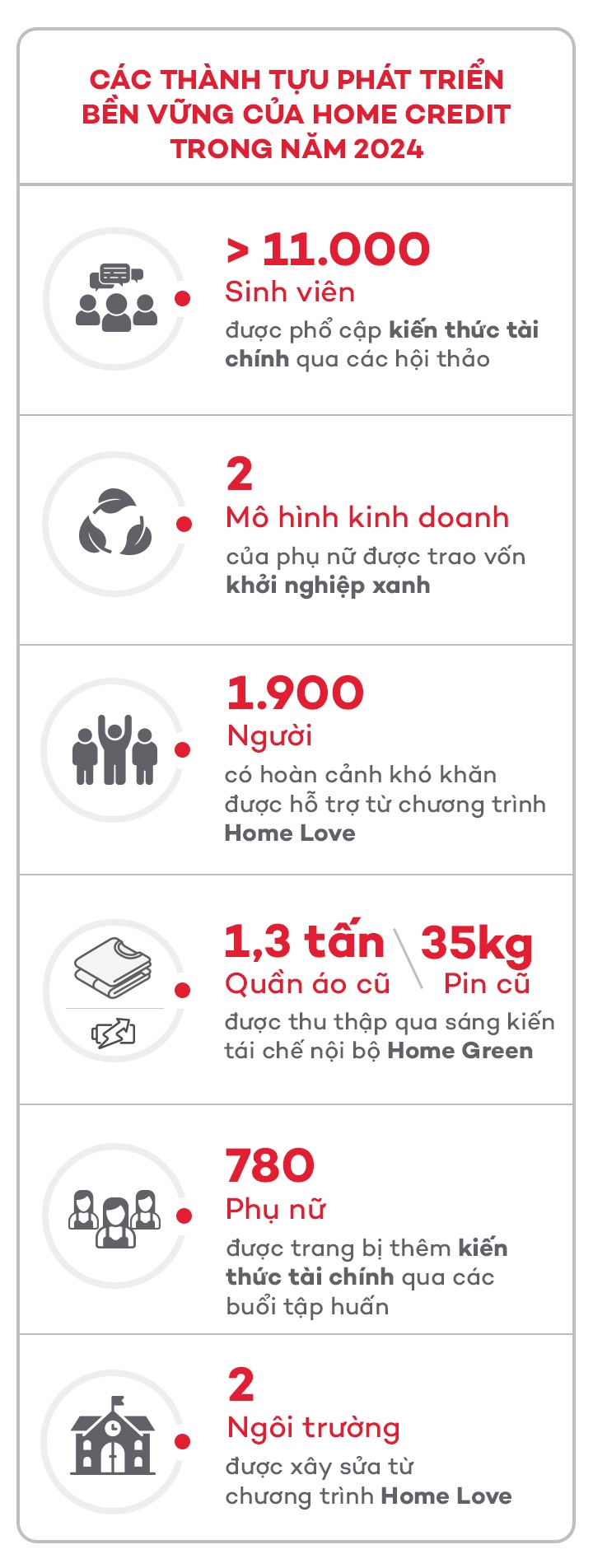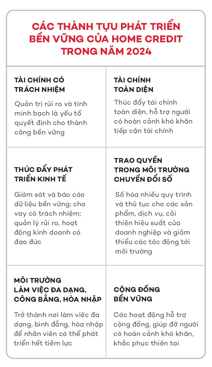 Song hành với sự tăng trưởng của Home Credit Việt Nam trong suốt 16 năm qua, các nguyên tắc ESG (Environment - Môi trường; Social - Xã hội; Governance - Quản trị) đã hòa quyện vào chiến lược tổng thể cũng như hoạt động vận hành ở tất cả bộ phận. Qua đó, doanh nghiệp không ngừng đạt được những dấu ấn mới, đóng góp vào sự phát triển bền vững của ngành tài chính tiêu dùng.