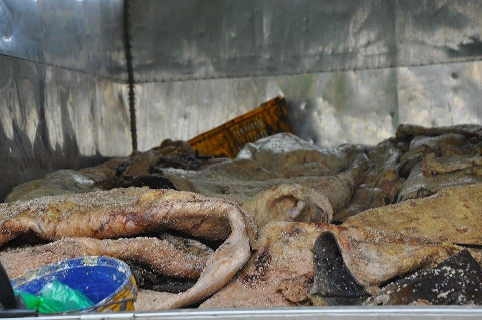 | 1,2 tấn da trâu đang trong quá trình phân hủy, bốc mùi trên xe tải. Ảnh: Hoàn Nguyễn. |