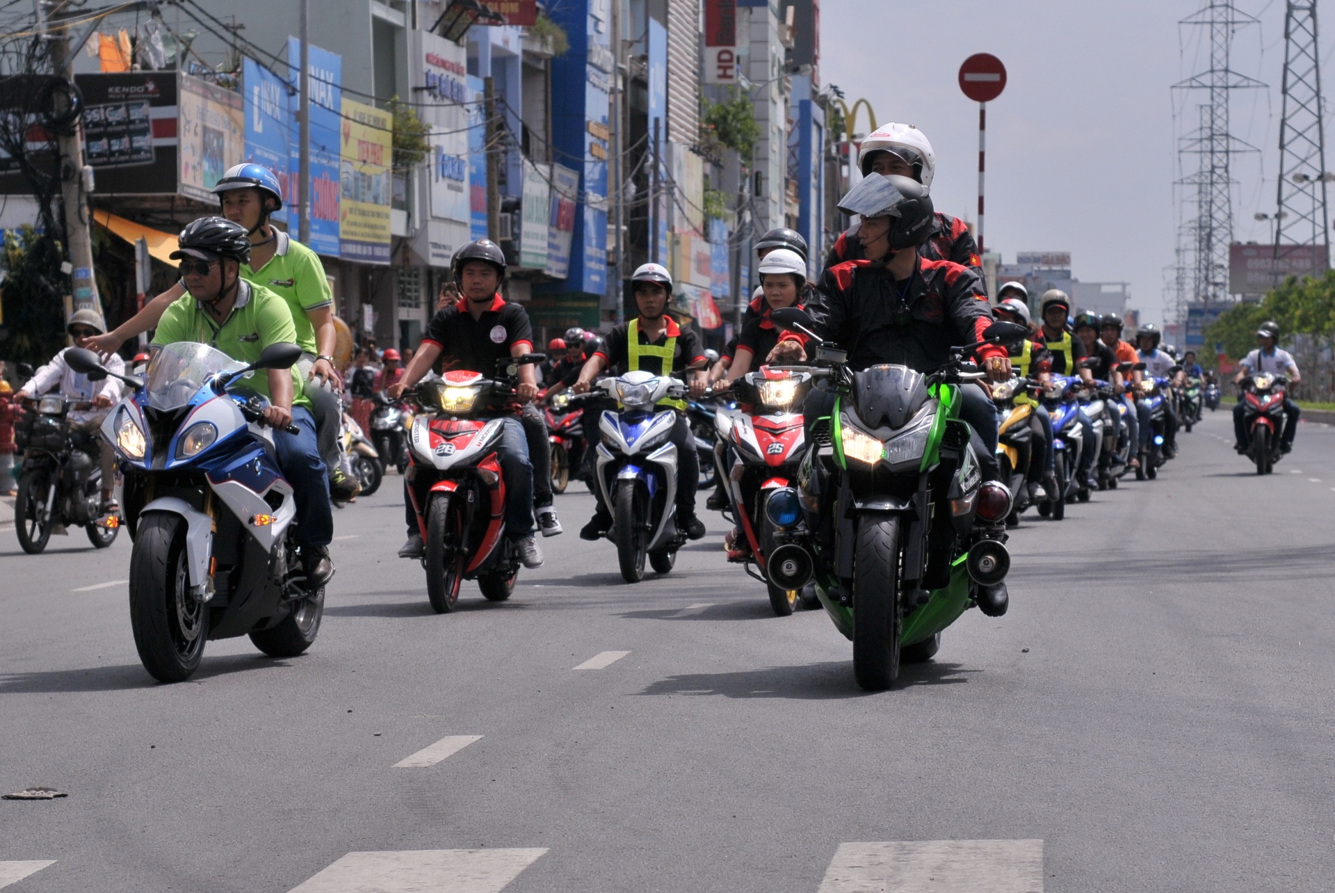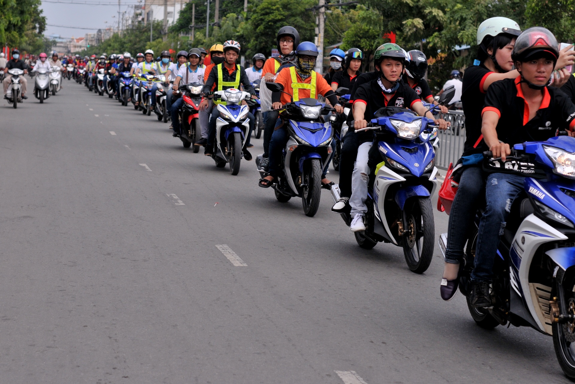 | Khoảng 10h, đoàn xe di chuyển qua các tuyến đường khu vực quận 6 để đến điểm tập trung. Dù số lượng lên tới hàng trăm xe nhưng do công tác tổ chức tốt nên di chuyển trật tự thành hàng thẳng. |