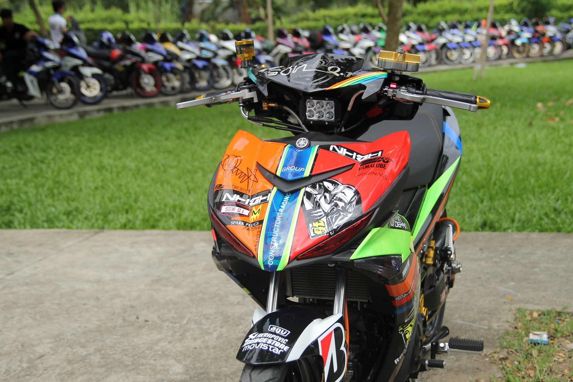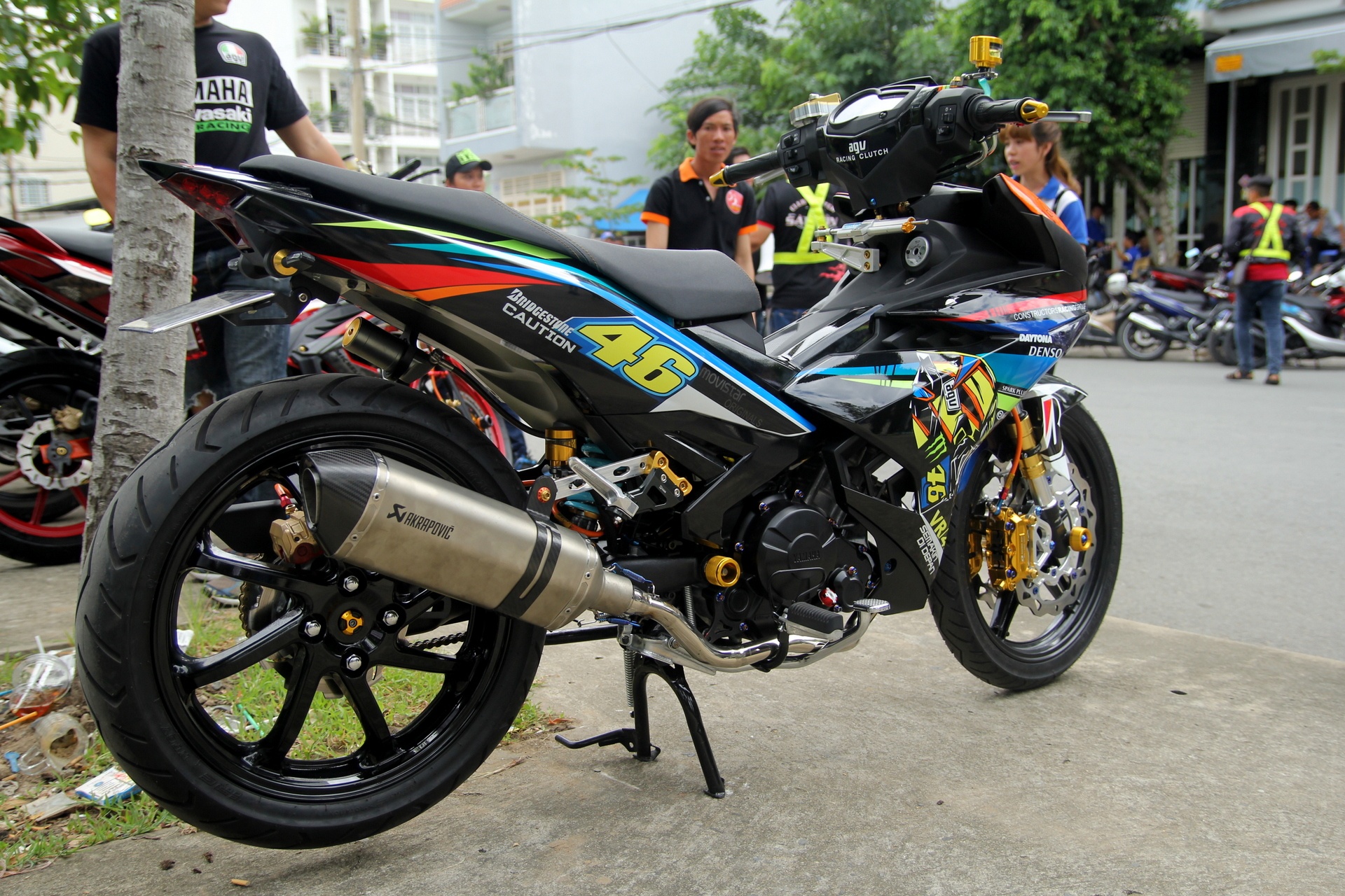 | Exciter 150 của thành viên Sơn Q1 được độ khá cầu kỳ, lên đồ chơi hàng hiệu và dàn áo phong cách MotoGP. |