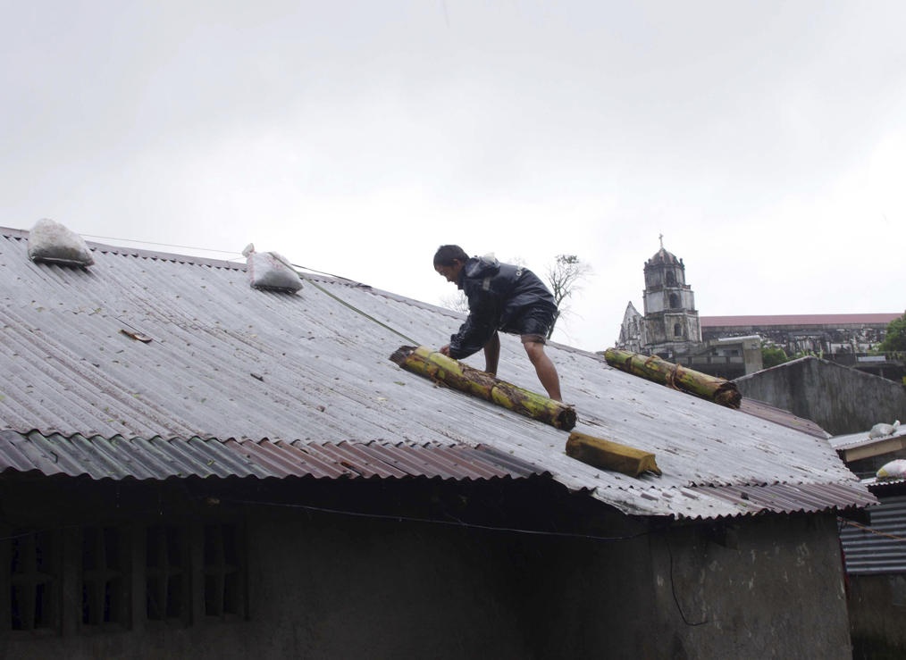| Một người đàn ông gia cố mái nhà bằng thân cây chuối để chống bão Haiyan tại thành phố Legazpi, tỉnh Albay, Philippines hôm 8/11. Ảnh: Reuters. |