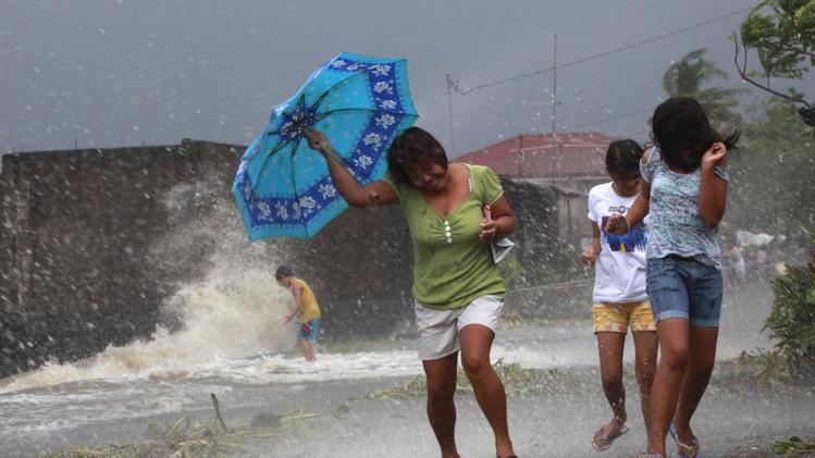 | Người dân bước dọc theo bờ biển tại thị trấn Bayog, tỉnh Laguna, Philippines khi bão Haiyan ập vào hôm 8/11. Ảnh: Reuters. |