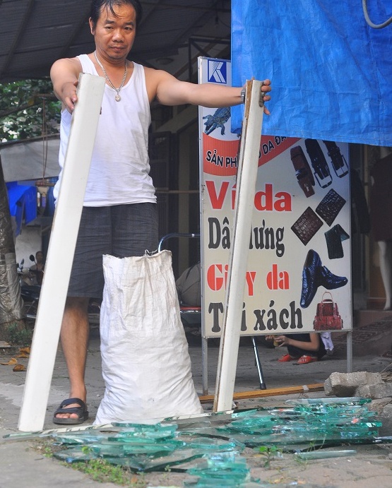 | Anh Lê Văn Tuần (48 tuổi) ở phường Âu Cơ, thị xã Phú Thọ đang thu dọn đống kính vỡ khi vụ nổ xảy ra. |