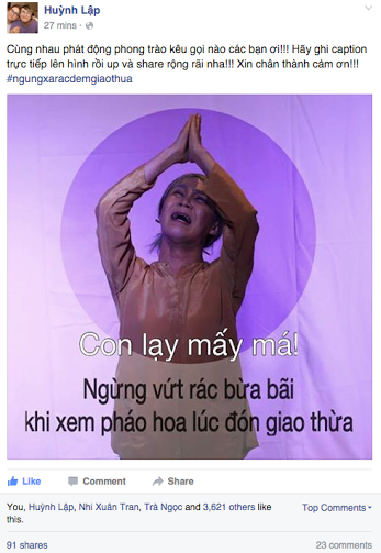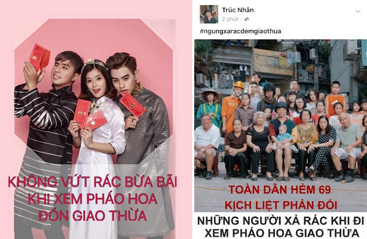 Mới đây, hơn 20 nghệ sĩ trẻ đã cùng đồng loạt đăng tải lên trang cá nhân thông điệp “Ngưng xả rác đêm giao thừa” nhằm kêu gọi cộng đồng có hành động văn minh hơn trong khoảnh khắc đón chào năm mới, cụ thể là việc xả rác nơi công cộng.