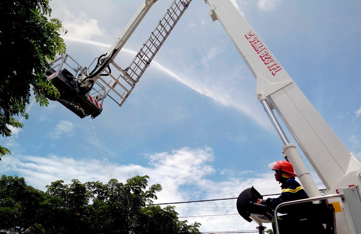 Đây cũng là lần đầu tiên, cảnh sát Đà Nẵng huy động 4 chiếc xe thang chuyên dụng để dập lửa. Các trụ nước cứu hỏa tại khu vực đường Kinh Dương Vương không sử dụng được khiến các xe chữa cháy phải chạy đi lấy nước nhiều lần.