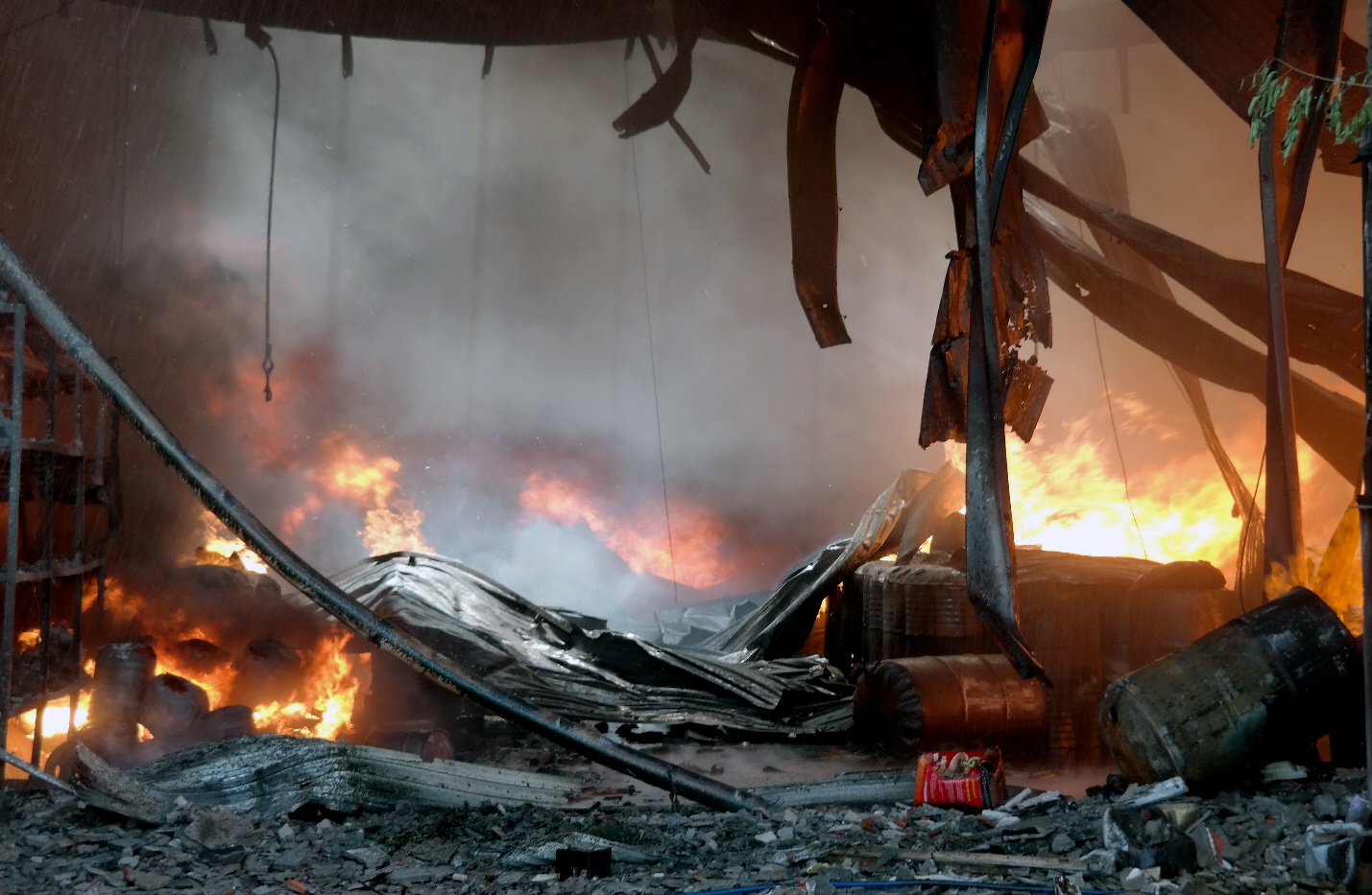 800 thùng sơn cùng nhiều trang thiết bị, máy móc khác đã bị ngọn lửa thiêu rụi hoàn toàn tại Công ty Thành Hoàng Châu, TP Đà Nẵng trong vụ hỏa hoạn trưa 15/7.