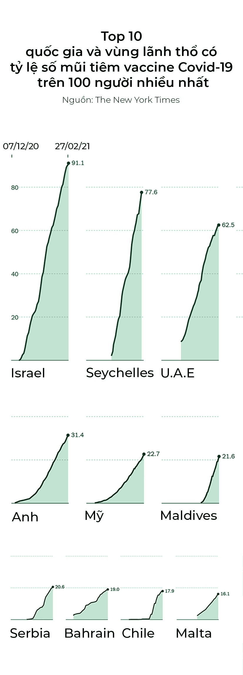Với dân số khoảng 9 triệu, Israel là nước đang đi đầu trong chương trình tiêm chủng diện rộng. Tỷ lệ tiêm vaccine ở nước này là 91,1 liều/100 người cho mũi đầu tiên, tính đến ngày 27/2.