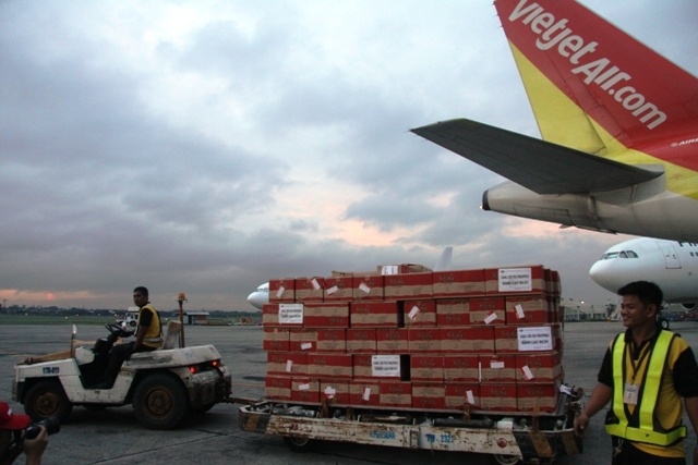 | Hàng viện trợ của VietJetAir đến Manila sáng ngày 21/11. |