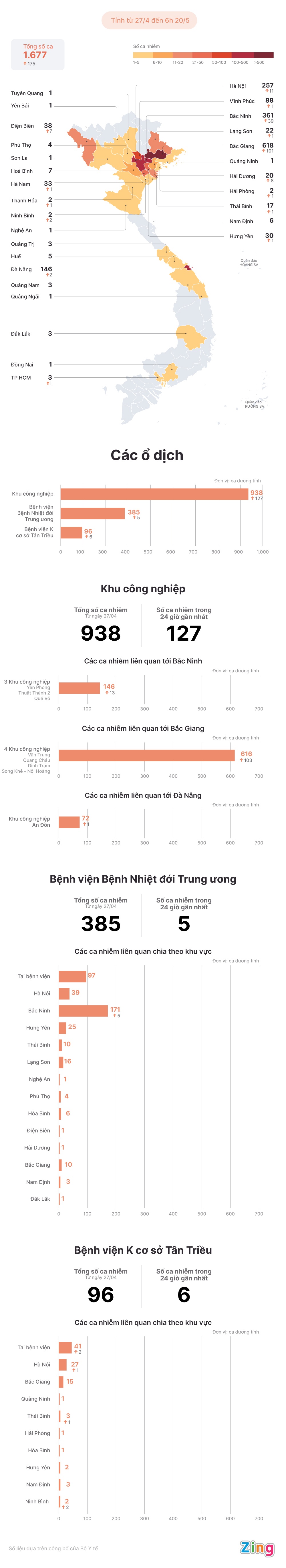 Từ 27/4 đến nay, Việt Nam phát hiện tổng cộng 1.677 người mắc Covid-19 tại 29 tỉnh, thành phố. Hầu hết ca mắc mới đều ghi nhận ở khu công nghiệp tại Bắc Giang.