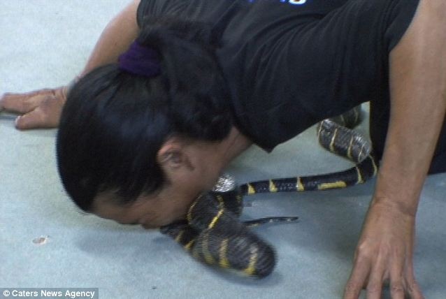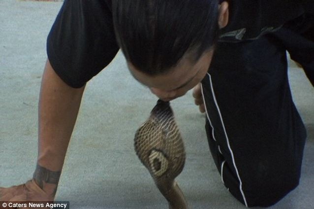 Dù không phải loài rắn độc nhất thế giới nhưng hổ mang châu Á gây ra cái chết cho hàng chục ngàn người mỗi năm. Tuy nhiên, bất chấp sự nguy hiểm của loài động vật này, người đàn ông ở Pattaya, Thái Lan vẫn nhẹ nhàng tiếp cận và hôn lên đỉnh đầu của nó. |