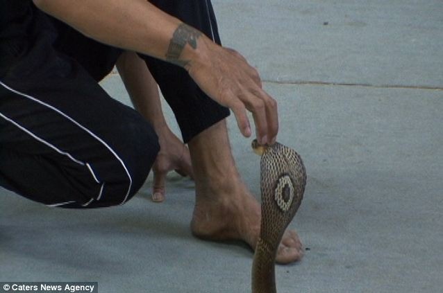 Người đàn ông dùng miệng nhấc bổng con rắn lớn khỏi mặt đất. Nếu con vật bất ngờ tuột khỏi miệng, nó sẽ cắn vào cơ thể người bắt nó. Nọc độc rắn hổ mang gây ra triệu chứng đau, sưng và hoại tử xung quanh vết thương. Chúng có thể giết một người trưởng thành nếu nạn nhân không được điều trị kịp thời. |
