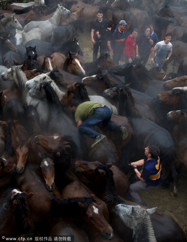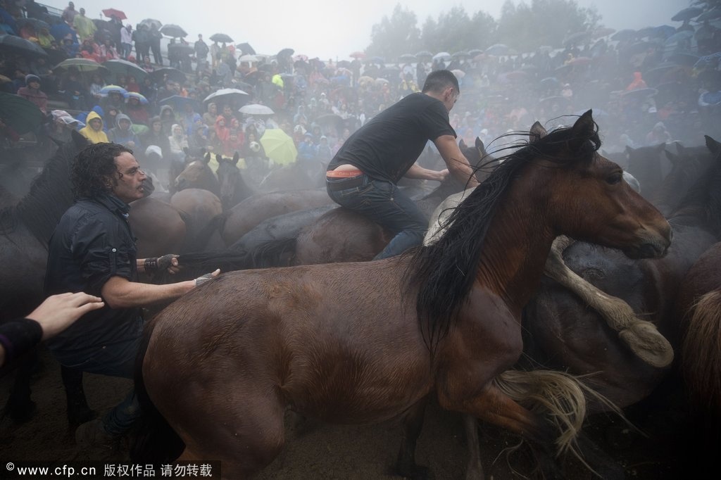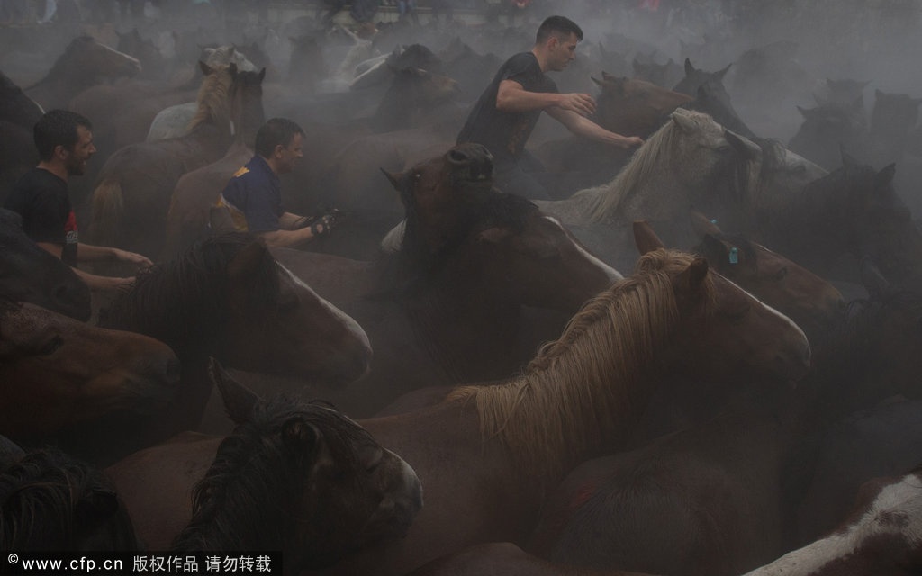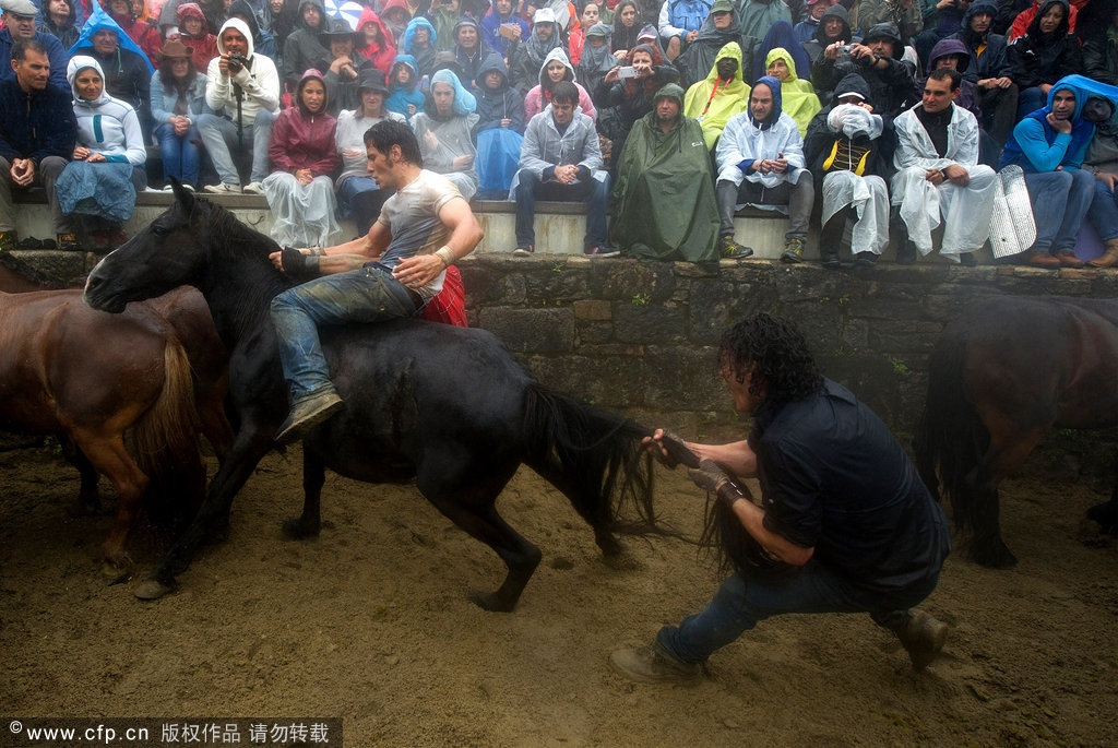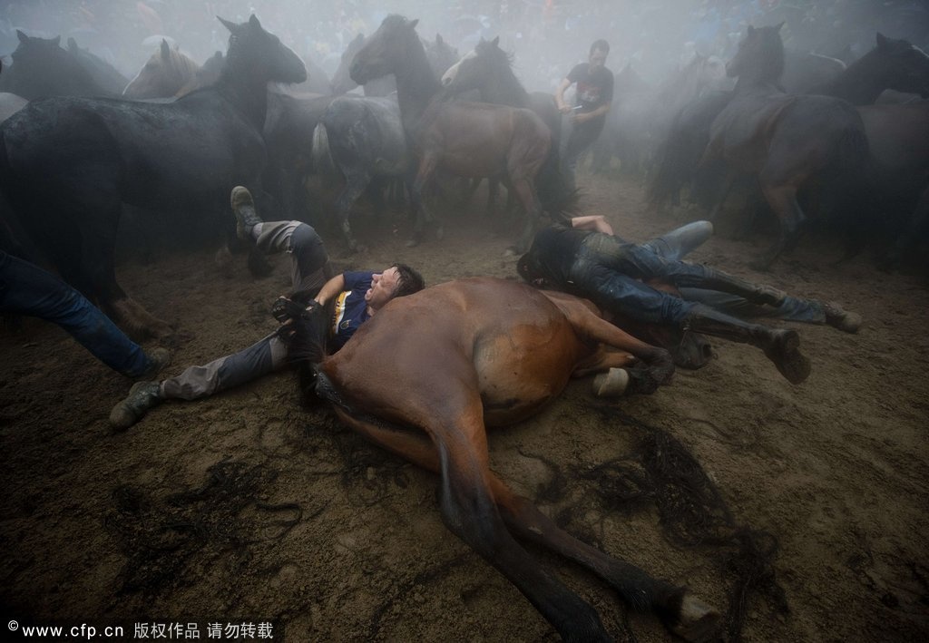 | Hôm 5/7, du khách và người dân địa phương ở thị trấn San Lorenzo de Sabucedo, vùng Galicia, tây bắc của Tây Ban Nha, đã tham gia lễ hội vật ngựa truyền thống (Papa das Besta) 400 năm tuổi. Đàn ngựa được lùa từ trên các ngọn núi xuống và quây lại thành một vòng tròn. |