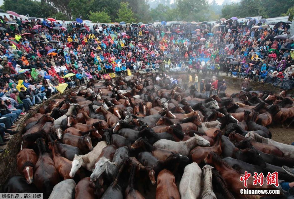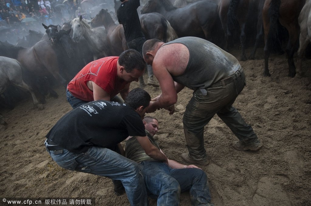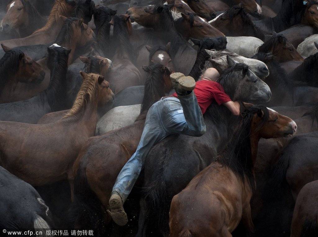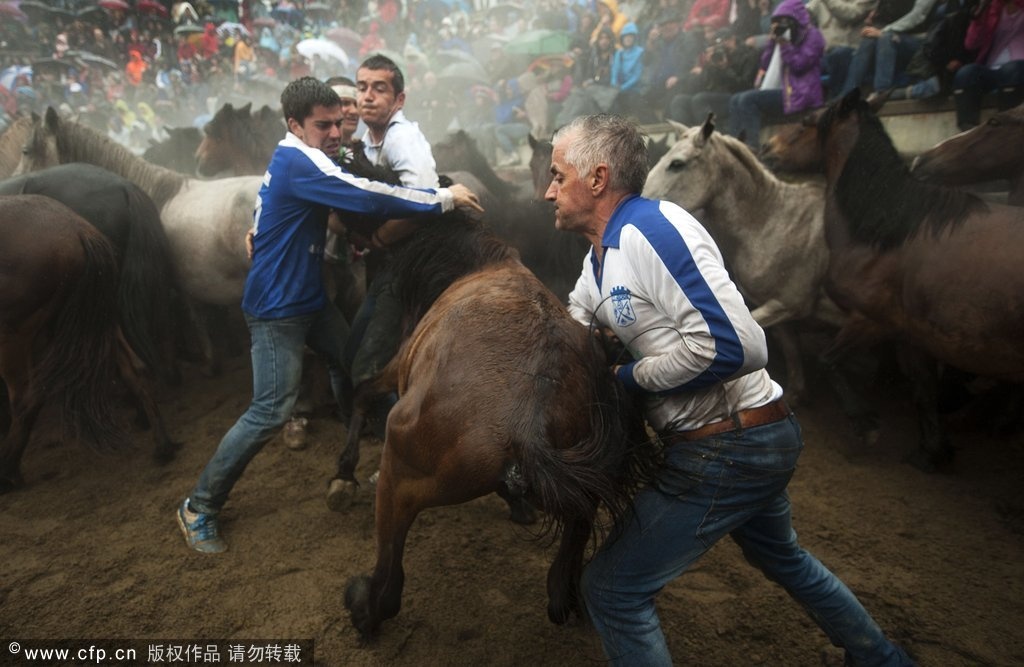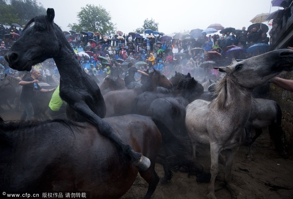 | Hôm 5/7, du khách và người dân địa phương ở thị trấn San Lorenzo de Sabucedo, vùng Galicia, tây bắc của Tây Ban Nha, đã tham gia lễ hội vật ngựa truyền thống (Papa das Besta) 400 năm tuổi. Đàn ngựa được lùa từ trên các ngọn núi xuống và quây lại thành một vòng tròn. |