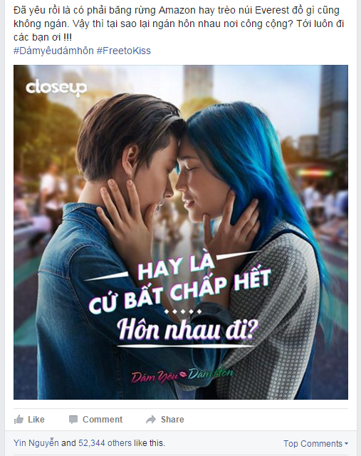 Trên trang cá nhân của mình, một bạn có nickname Meo Beo chia sẻ dòng trạng thái đầy hứng khởi: “Hãy luôn ‘gấu’ để tình yêu thật ngầu chứ đừng hèn nhát bởi lòng đố kỵ của mọi người. Đừng vì những lời ghen ghét mà bỏ qua cơ hội hôn nhau ở nơi công cộng để thể hiện tình yêu. Bạn vẫn tiếp tục khoe những nụ hôn nóng bỏng và mặc kệ những ai ganh tị với mình chứ? Bạn dám hôn để xem phim Tết không?”. Cùng với những chia sẻ đó là một bức hình thể hiện tình yêu ngọt ngào của một đôi bạn trẻ.