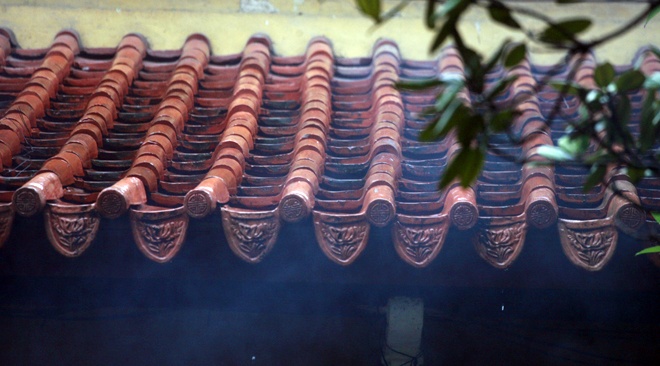 Những mái đình cổ kính hòa lẫn vào làn khói chiều, tạo nên hình ảnh thơ mộng và yên bình.