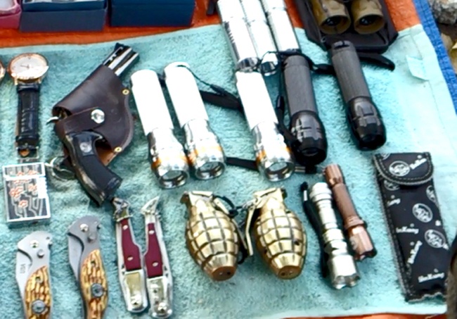 Một người bán hàng cho biết đa số các loại hàng ở đây có nguồn gốc từ Trung Quốc. Bán chạy nhất là các loại bật lửa hình lựu đạn và súng dùng xăng hoặc ga.
