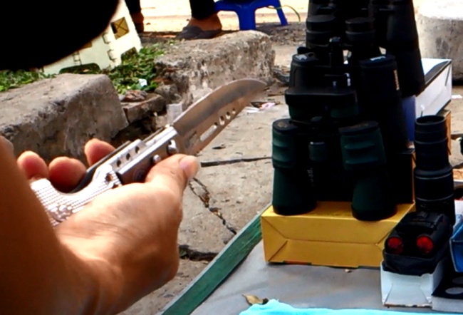 | Ngoài ra, tại đây còn bán dao bấm sắt nhọn, đủ loại. Người bán quảng cáo là hàng "xịn", làm bằng thép không gỉ, nhiều con dao còn trang bị cả đèn pin. |
