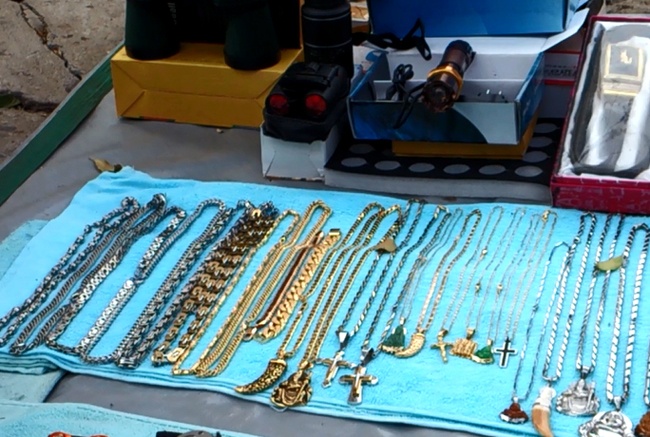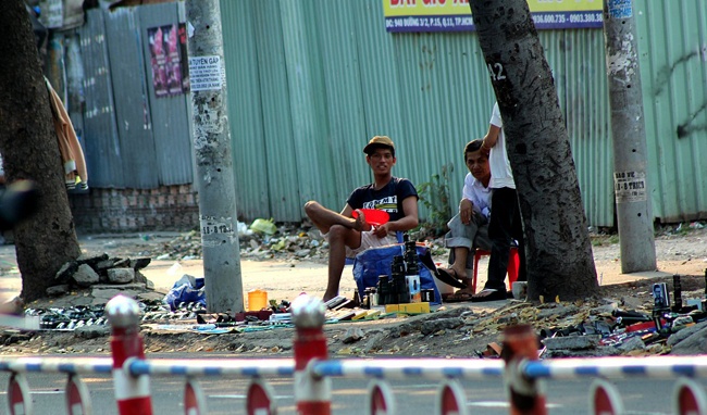 Trên đường 3 Tháng 2, đoạn giao với đường Lê Đại Hành (quận 11), hàng chục gian hàng rong bày bán đủ loại mặt hàng, từ vàng giả, mắt kính, nước hoa, đồng hồ cho đến các loại bật lửa chình súng, lựu đạn và dao bấm.