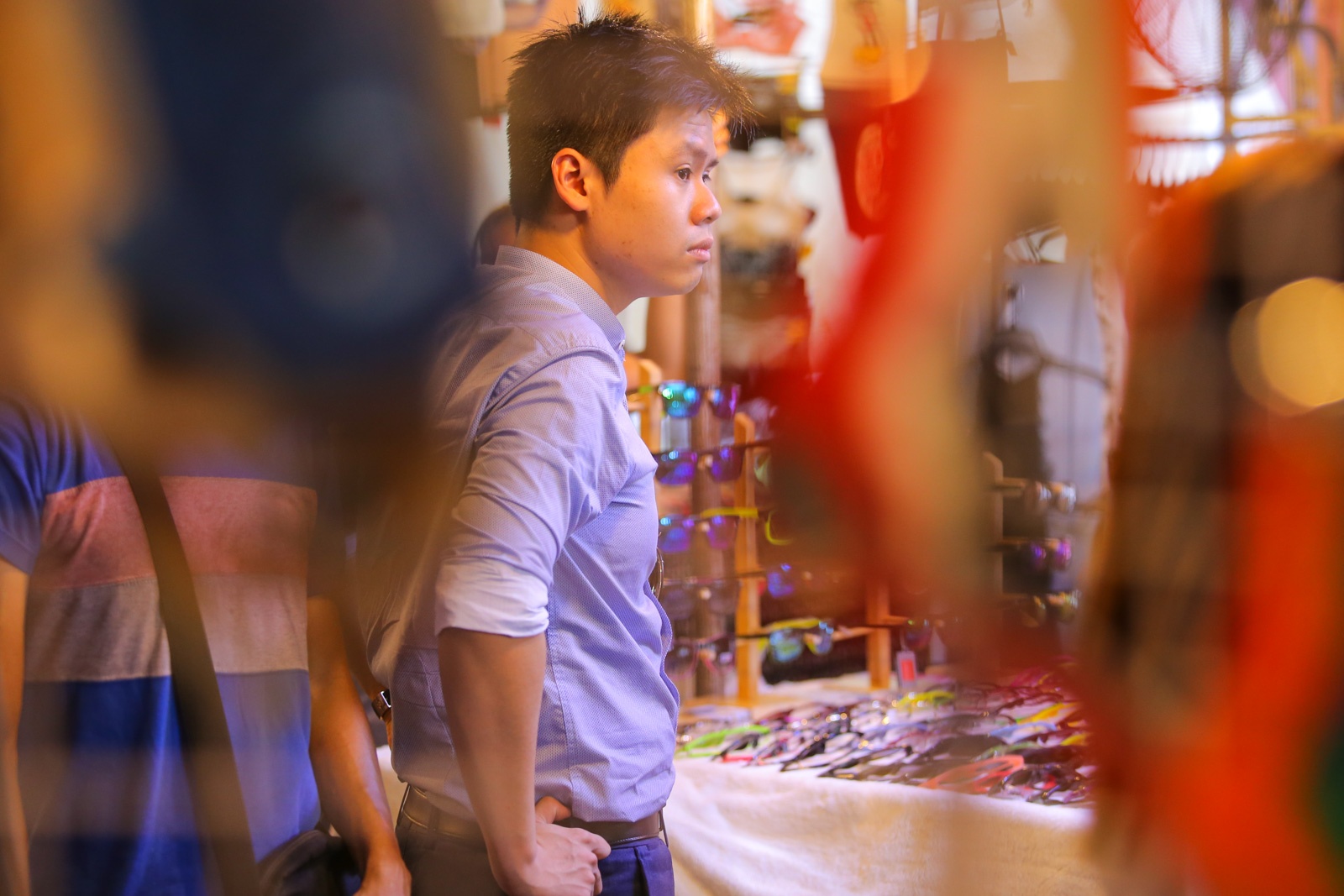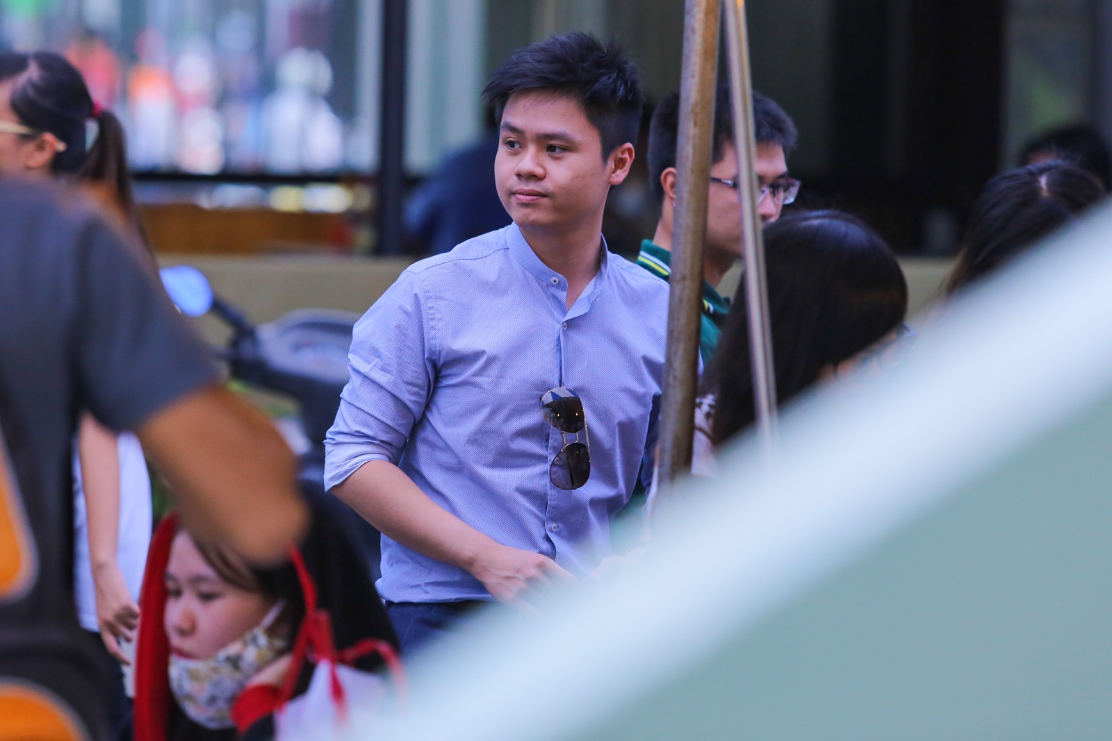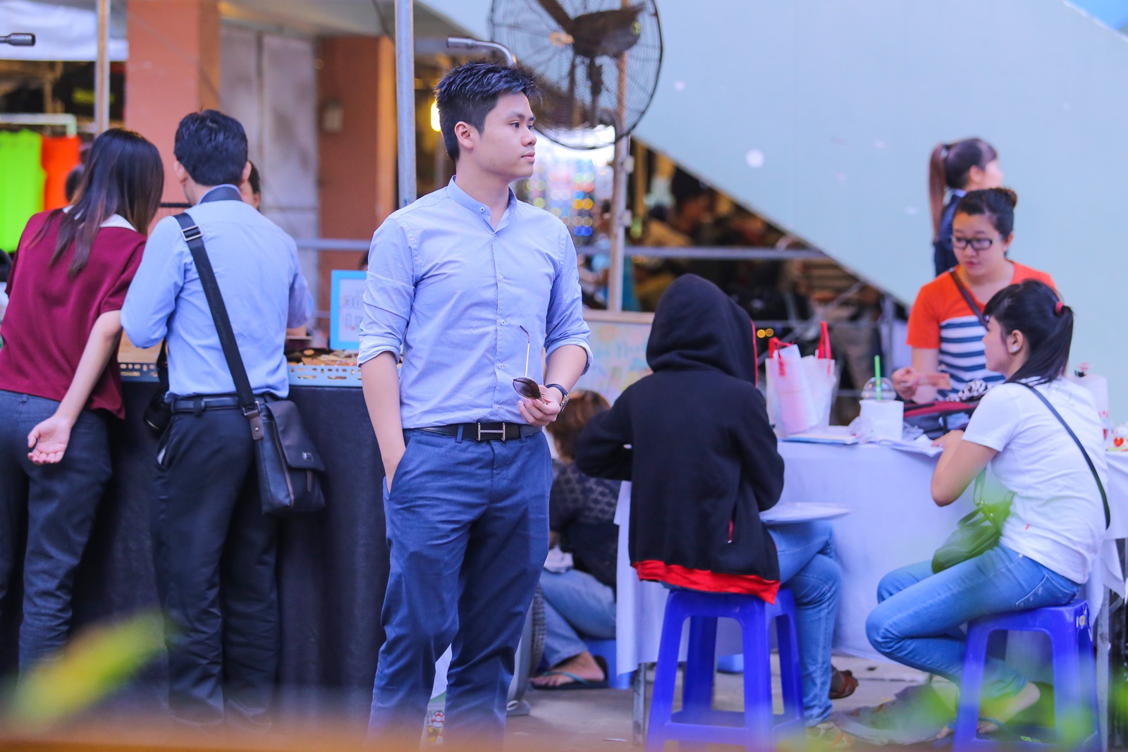 Sáng 13/11, theo thường lệ, thiếu gia Phan Thành đến hội chợ để theo sát các hoạt động kinh doanh của gian hàng thời trang. Hôn phu của người đẹp điện ảnh Việt ăn vận lịch sự với áo sơ-mi quần jeans xanh.