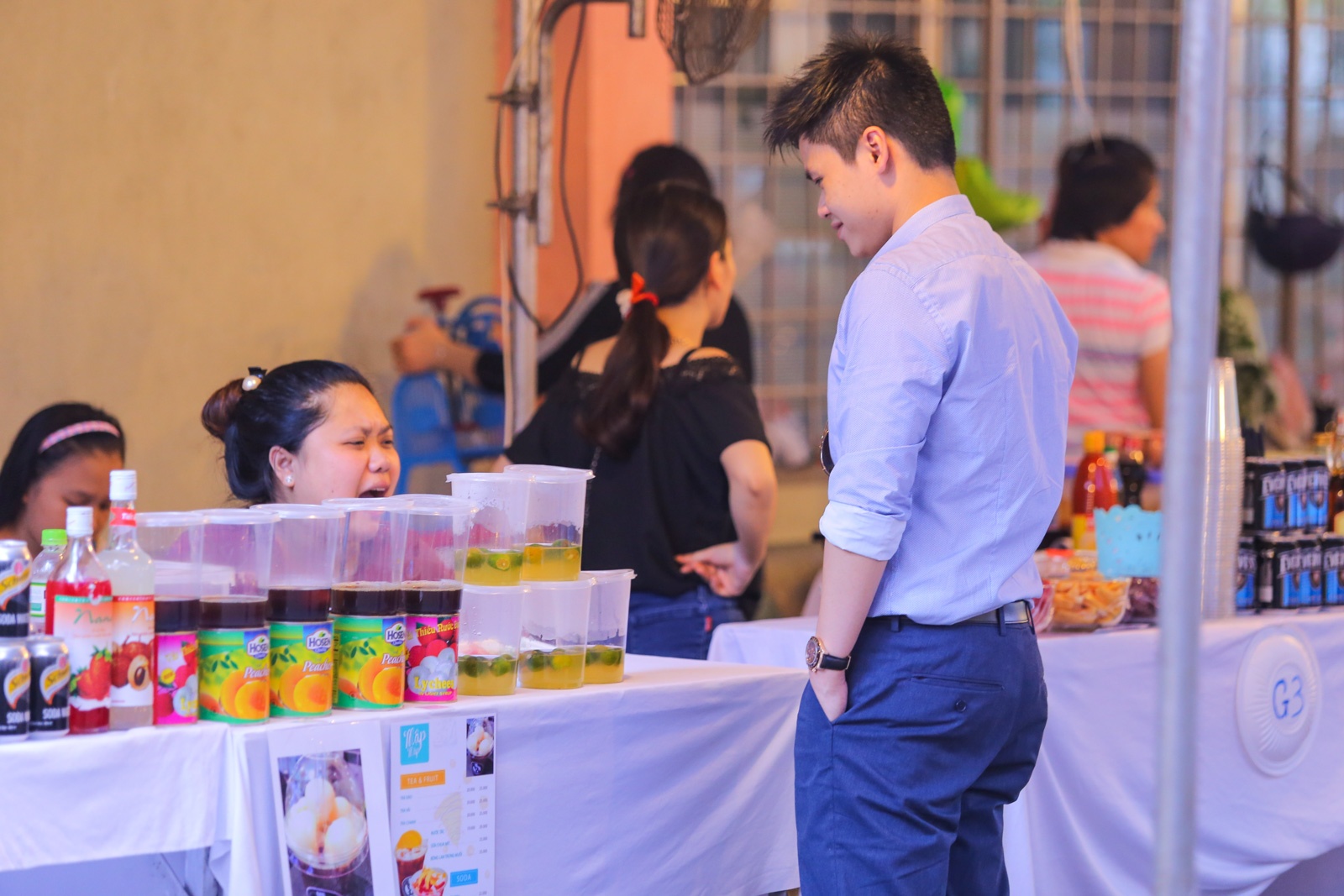 | Phan Thành hỏi thăm tình hình buôn bán của một số gian hàng nước uống. |