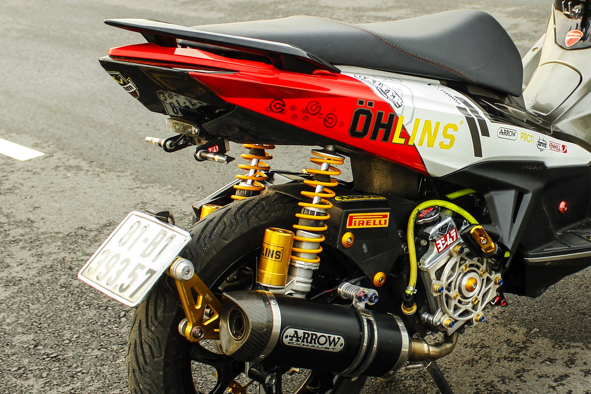 | Những món phụ kiện đáng giá phía sau bao gồm phuộc Ohlins, ống pô Arrow cùng bảo vệ quạt tản nhiệt, pat biển số độ. Cụm đèn sau sơn khói, hai xi-nhan nhỏ chiếu sáng bằng bóng LED. |