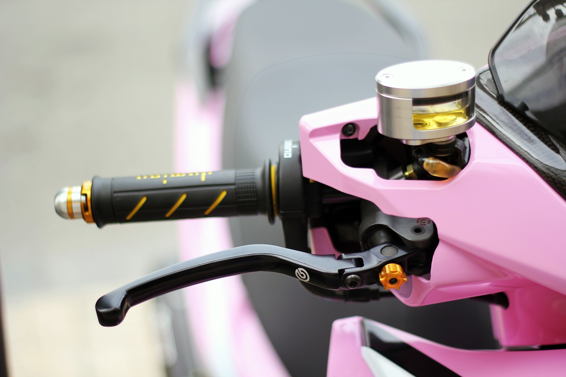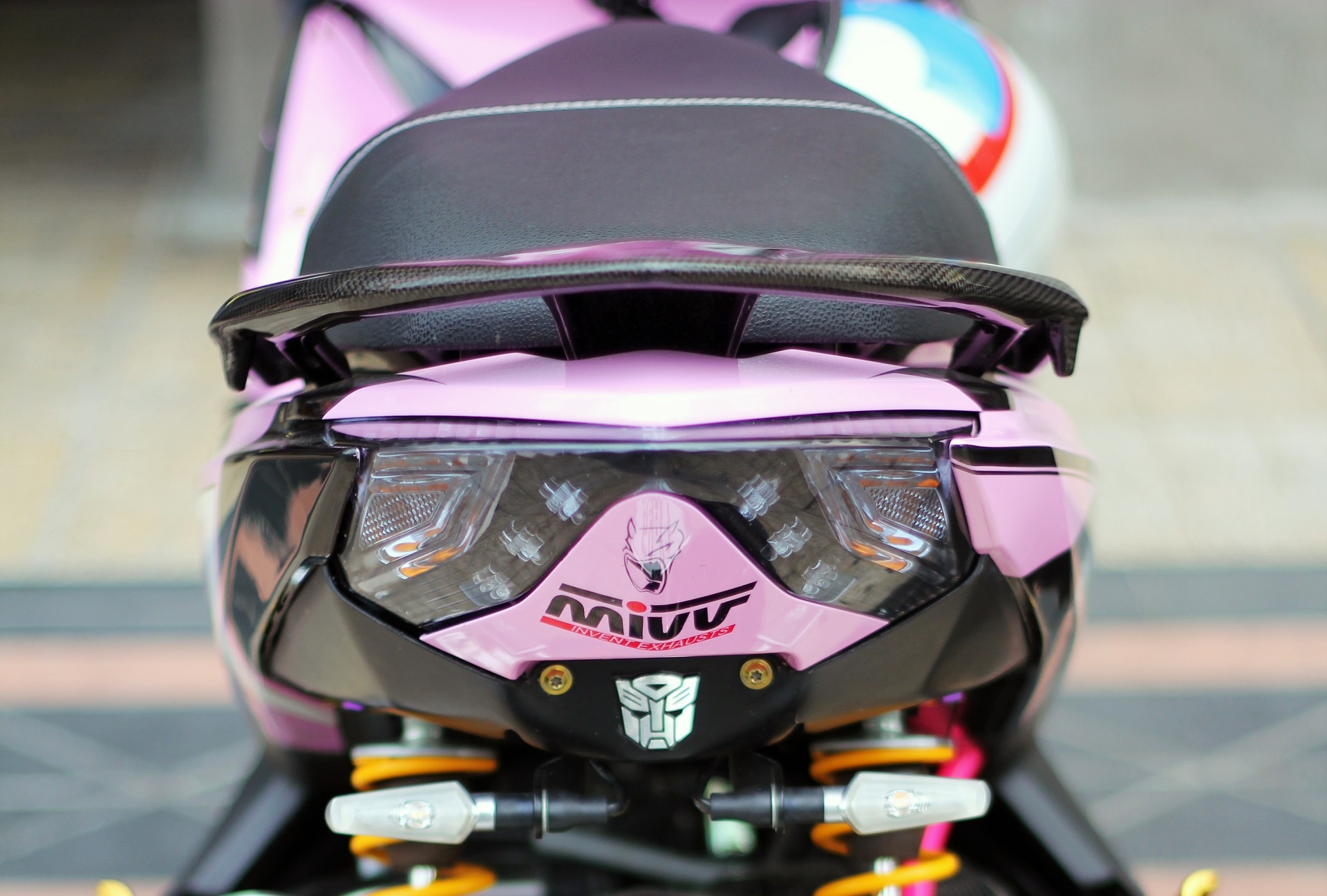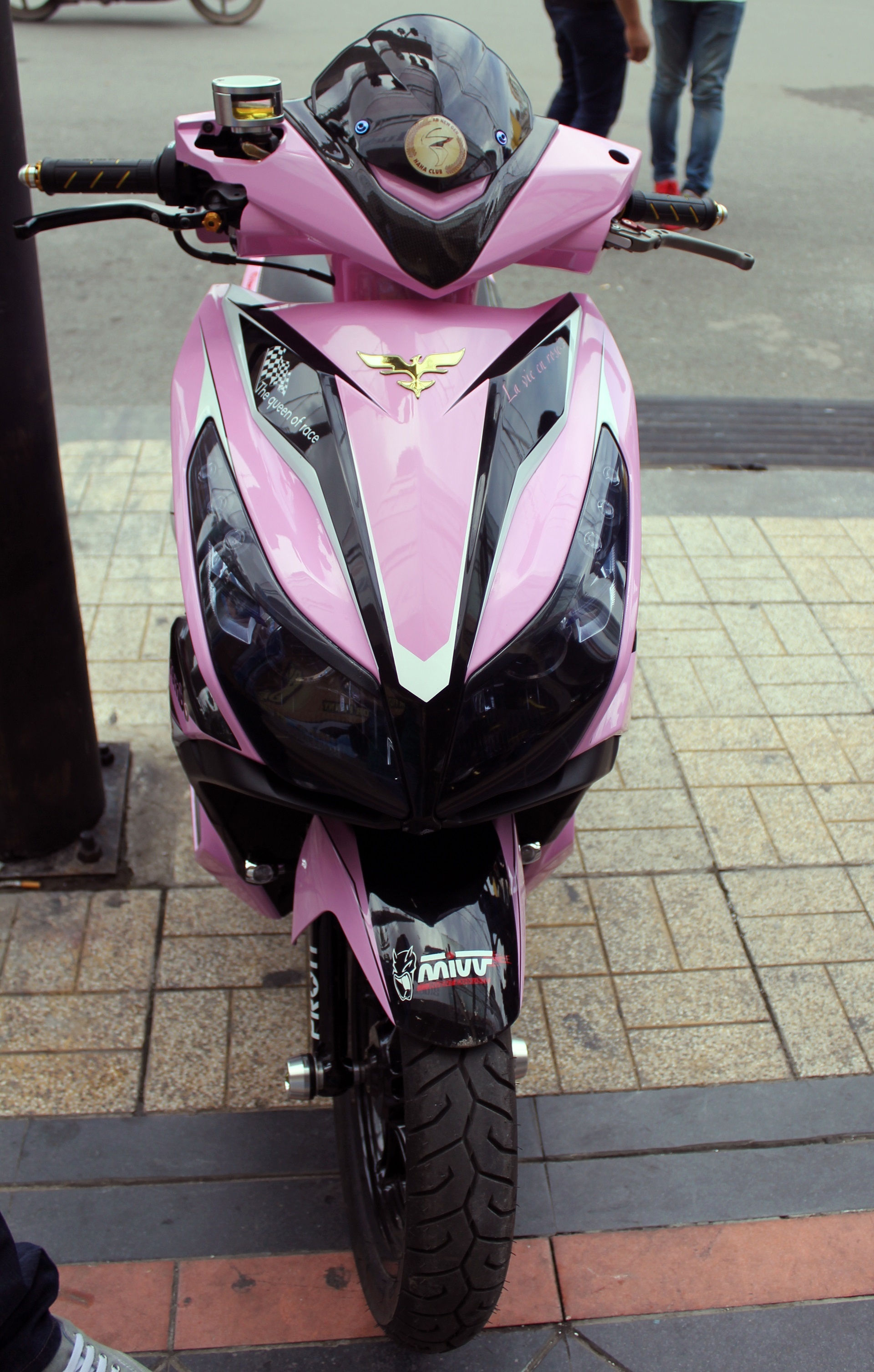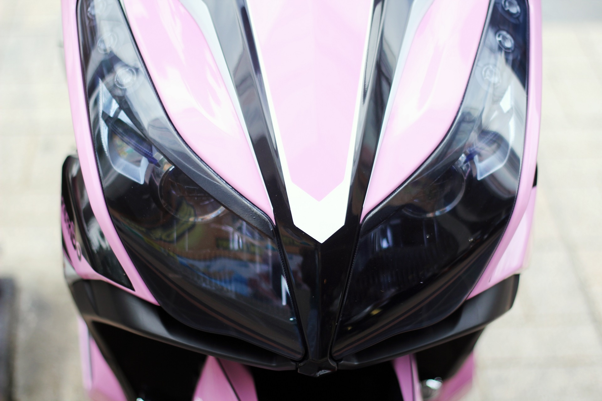 | Phần đầu xe được tạo hình bắt mắt với hai màu chủ đạo là hồng và đen. Chóa đèn được sơn đen, tăng độ ngầu cho chiếc xe. Mặt nạ được dán tem kiểu "đại bàng". |