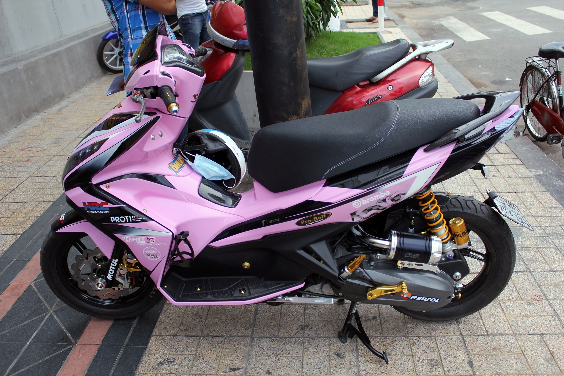 | Chiếc Honda Air Blade 125 được sơn màu hồng, tem xe được dán lại và thay thế nhiều phụ tùng đắt tiền. |
