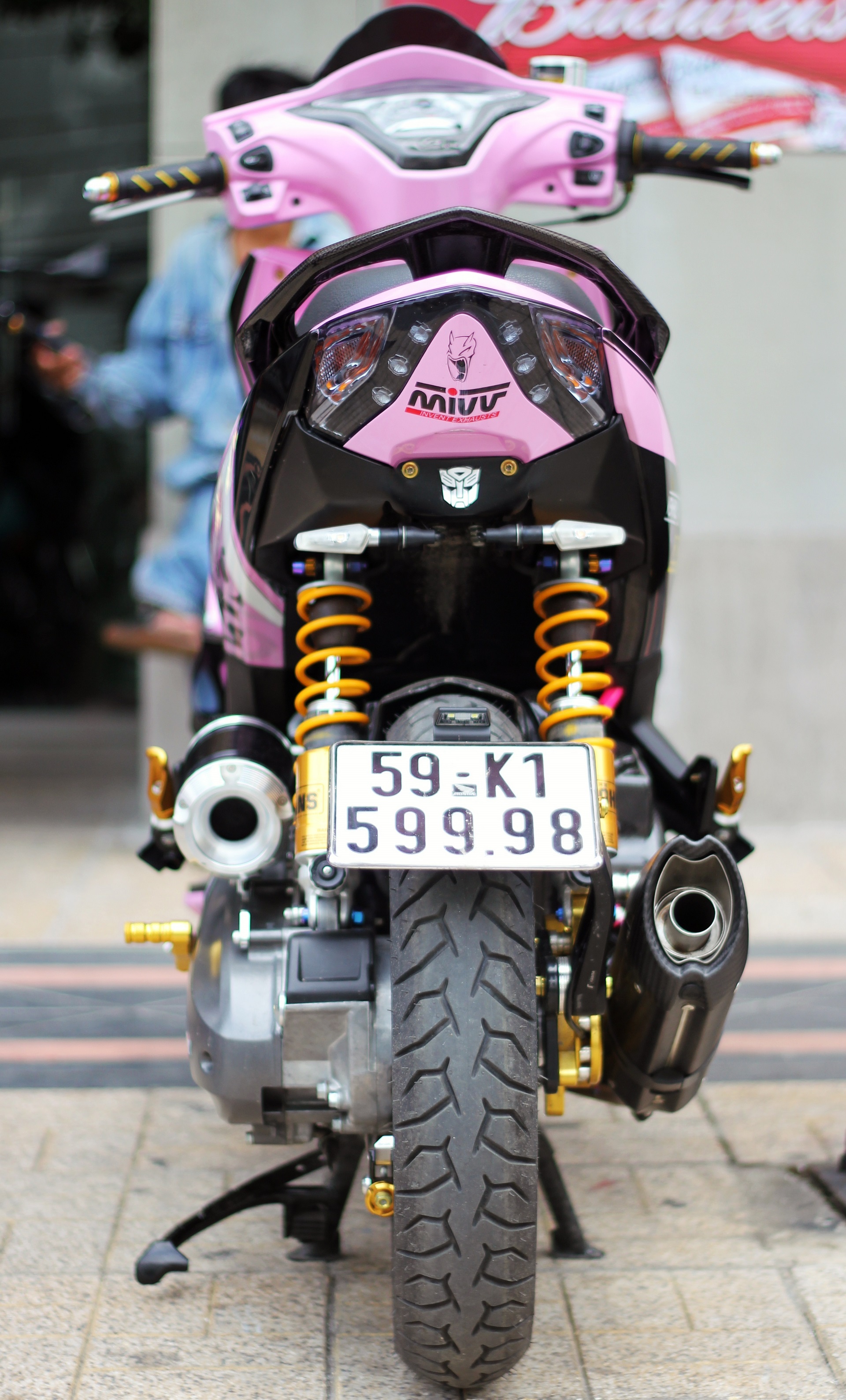 | Biển số được gắn với trục sau bằng một cây chống. Xe được gắn 2 ống pô hai bên. |