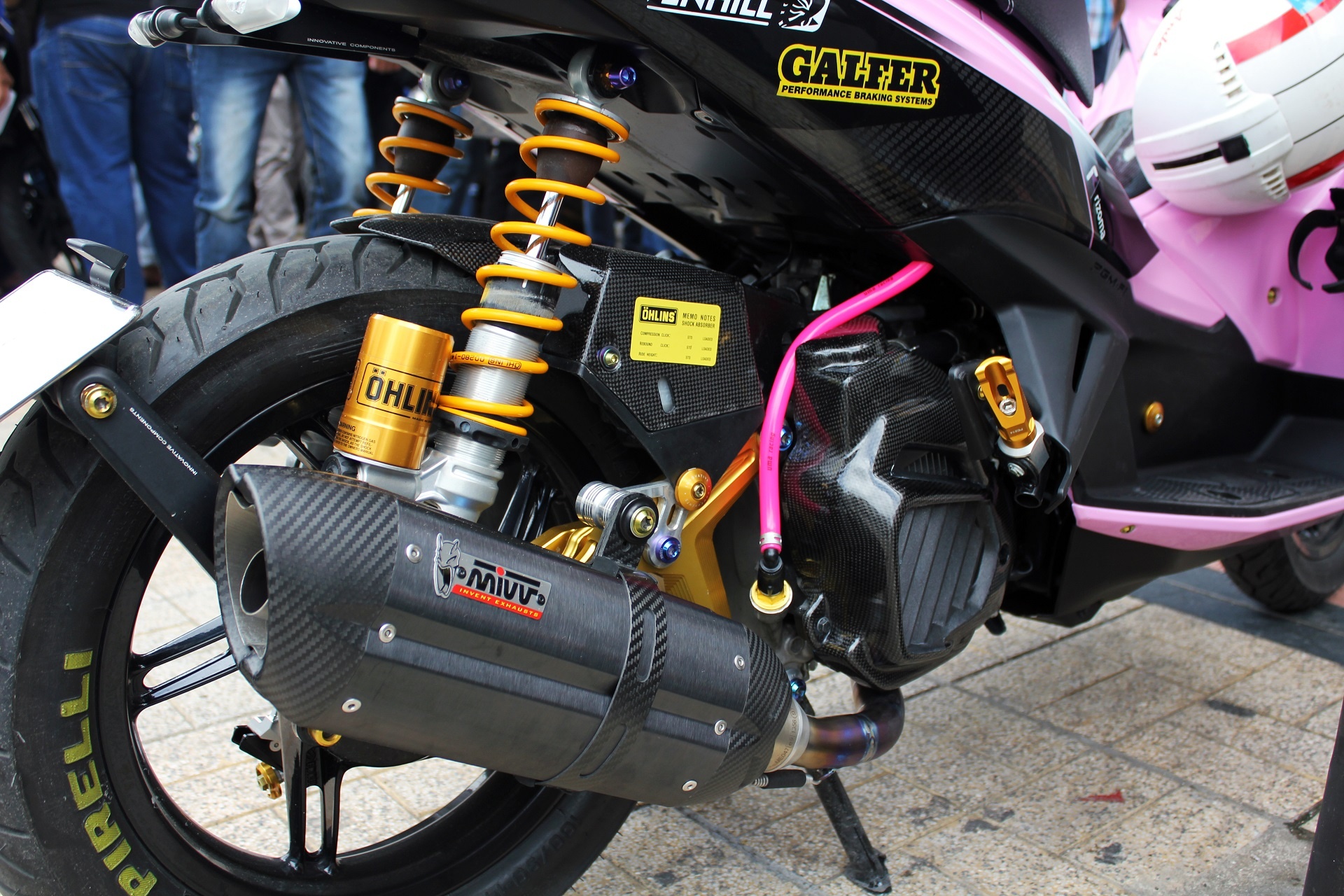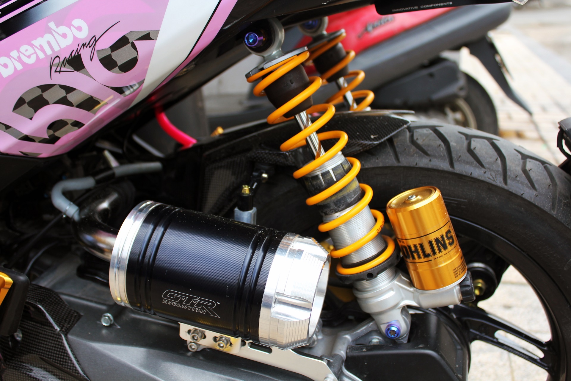 | Giảm xóc sau của hãng Ohlins. Pô air hiệu GTR có gắn ống giải nhiệt nhớt. Ống pô này giúp xe tăng tốc nhanh hơn, gió vào nhiều nên tạo âm thanh mạnh mẽ. Chỉ riêng ống pô giá khoảng hơn 2 triệu đồng. |