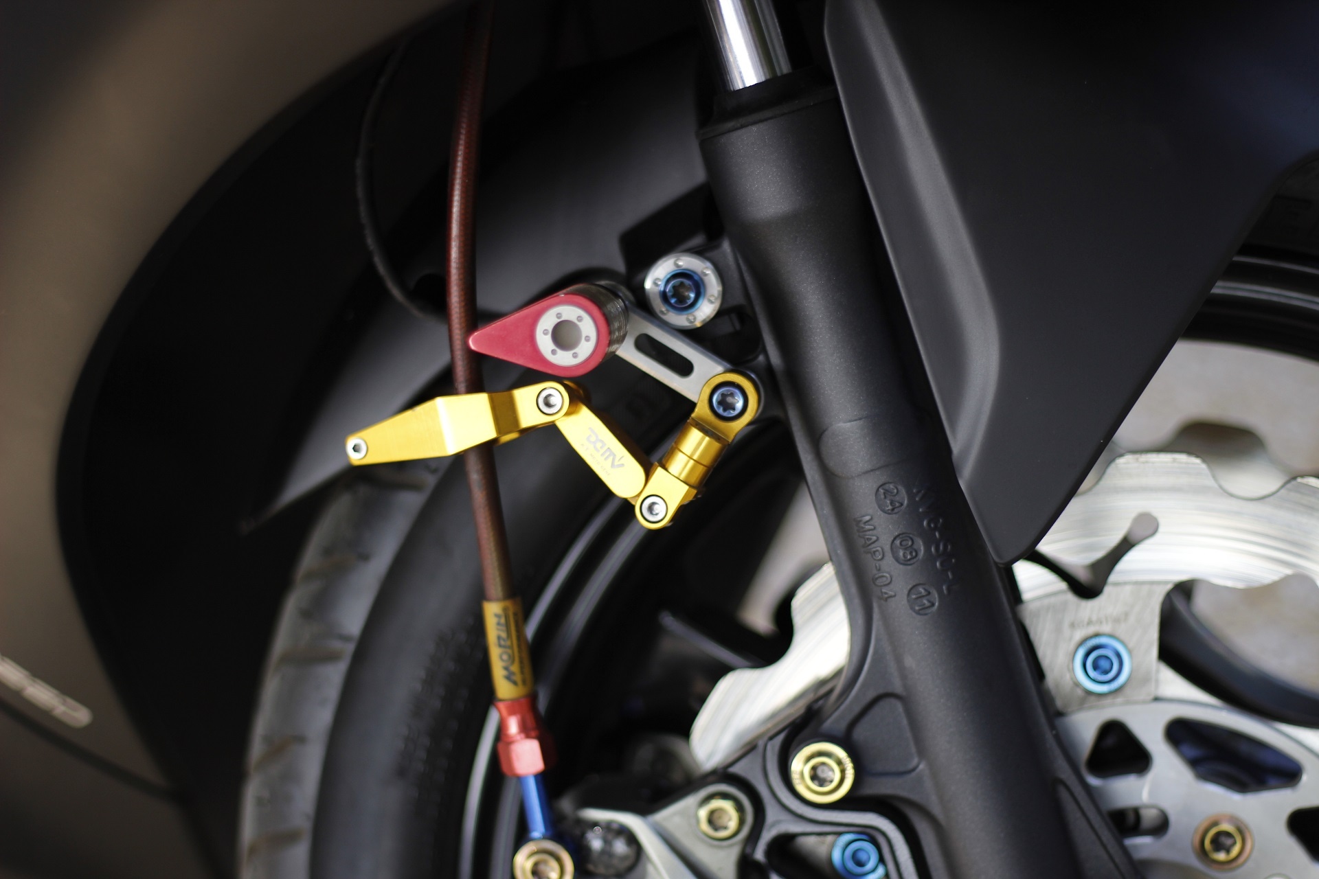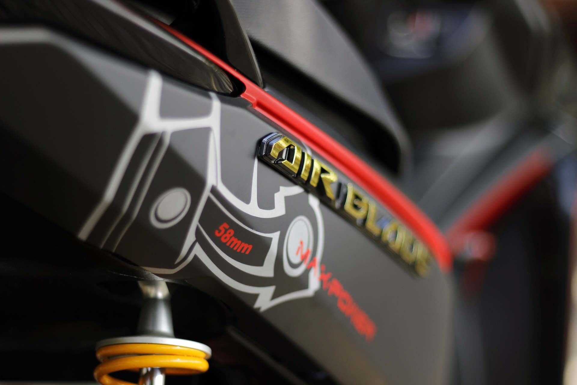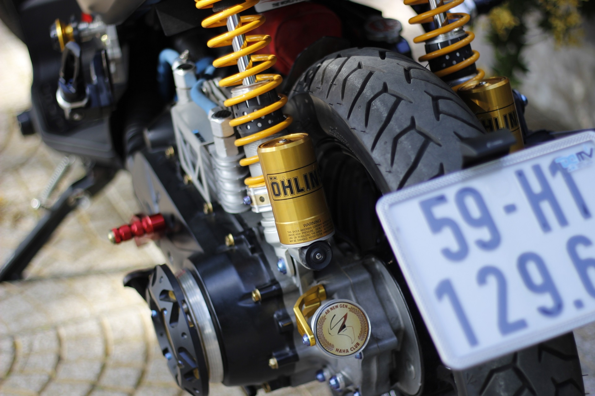 | Chiếc pat màu vàng hiệu DMV dùng để cố định logo câu lạc bộ "HaHa Club - Airblade New Generation" mà Jun Ho là người đứng đầu. Ngoài ra, một món đồ chơi giá trị trên chiếc xe này không thể không nhắc tới là cặp giảm sốc Ohlins cùng bình dầu lớn. |