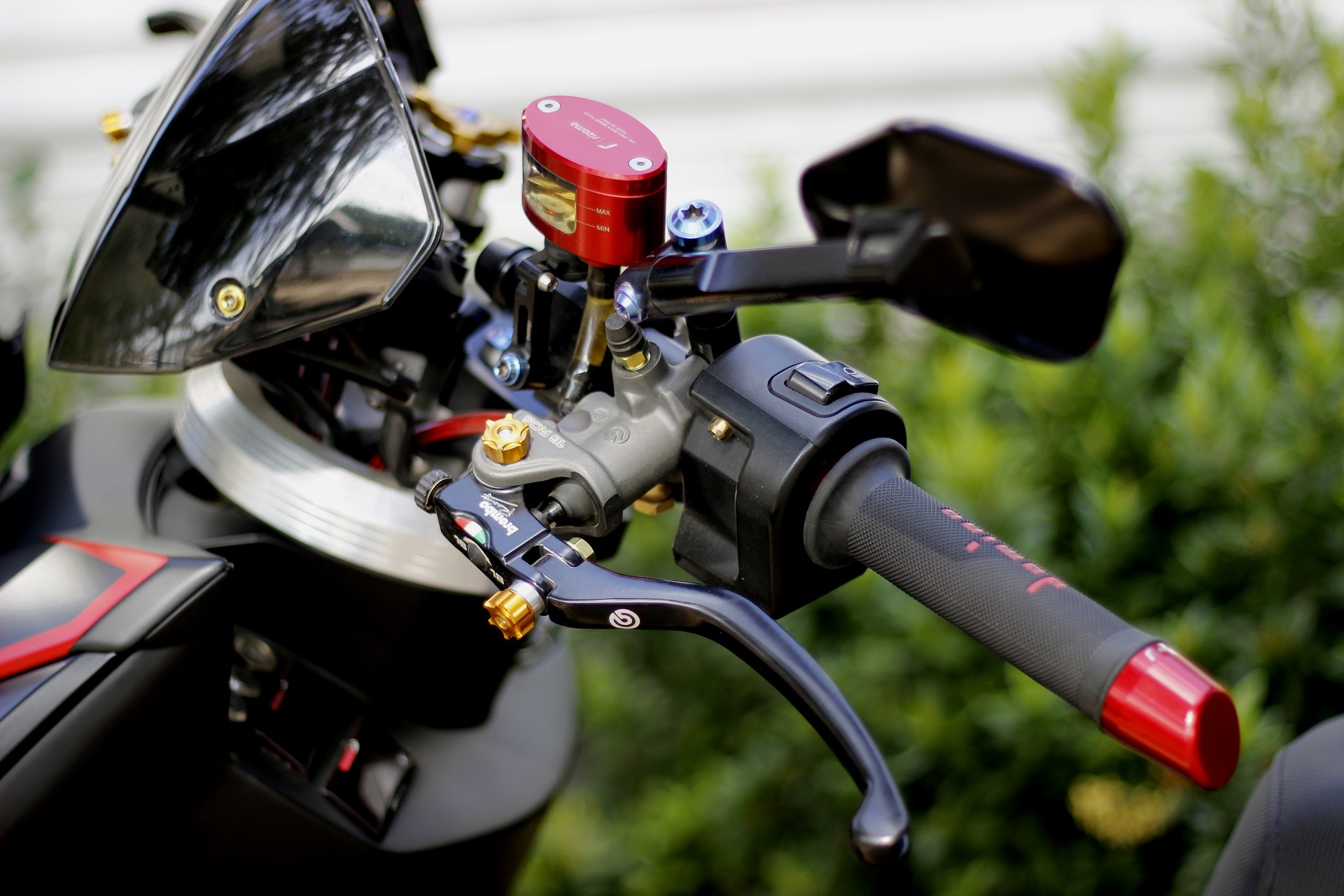 | Cùm thắng RCS kết hợp núm vặn Ohlins màu vàng là điểm nhấn trên tay lái. |