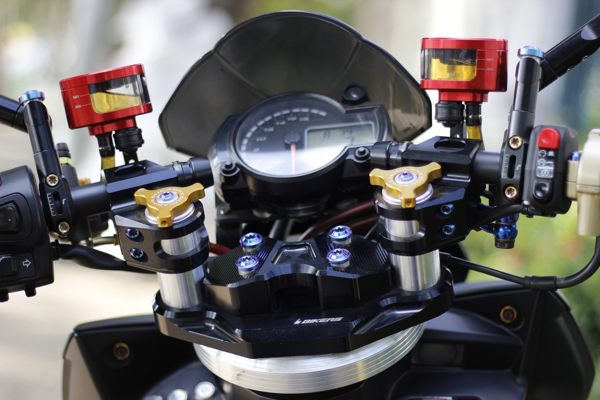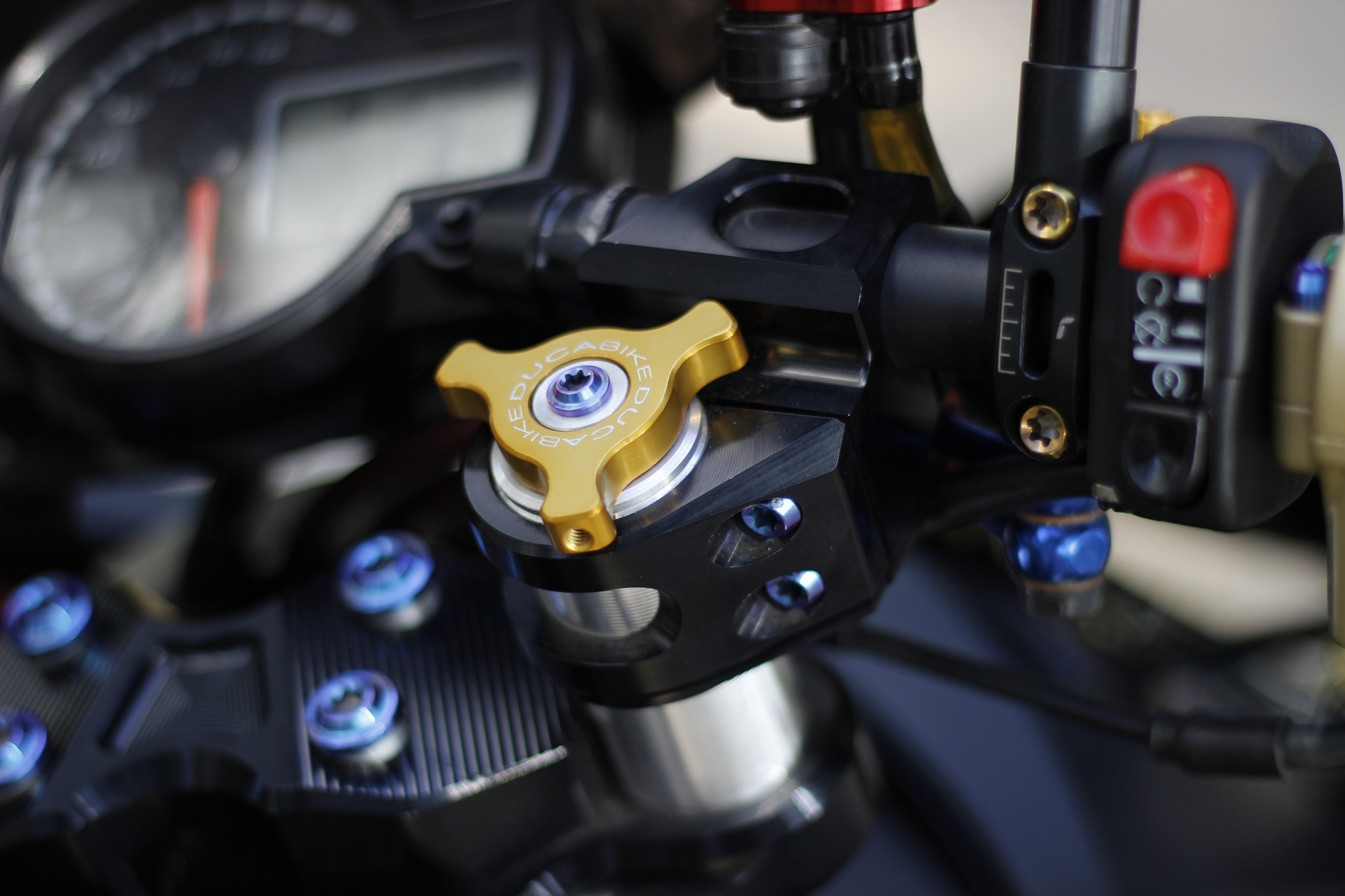 | Hai con chốt tán ghi đông hiệu Ducabike màu vàng chính hãng của Ý, hai ốc Proti màu xanh là điểm nhấn nổi bật trên dàn đầu. |