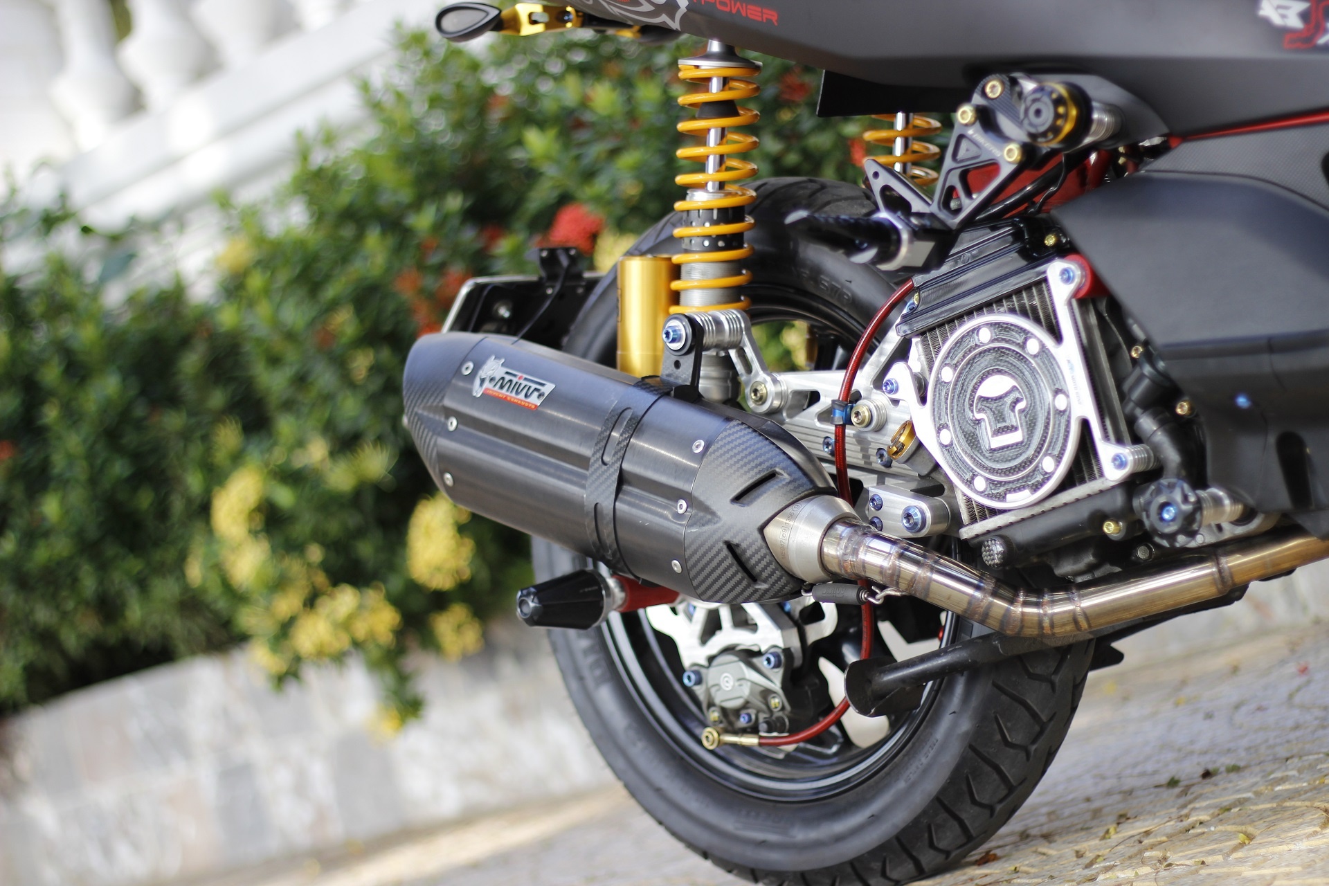 | Xe được lắp nhiều đồ chơi hàng hiệu phía sau như những ốc kiểng, heo dầu Brembo, két tản nhiệt độ... |