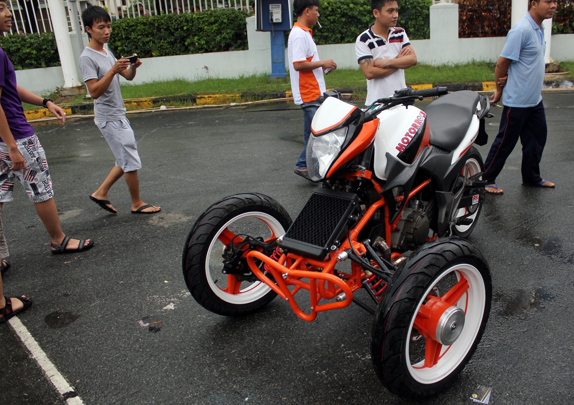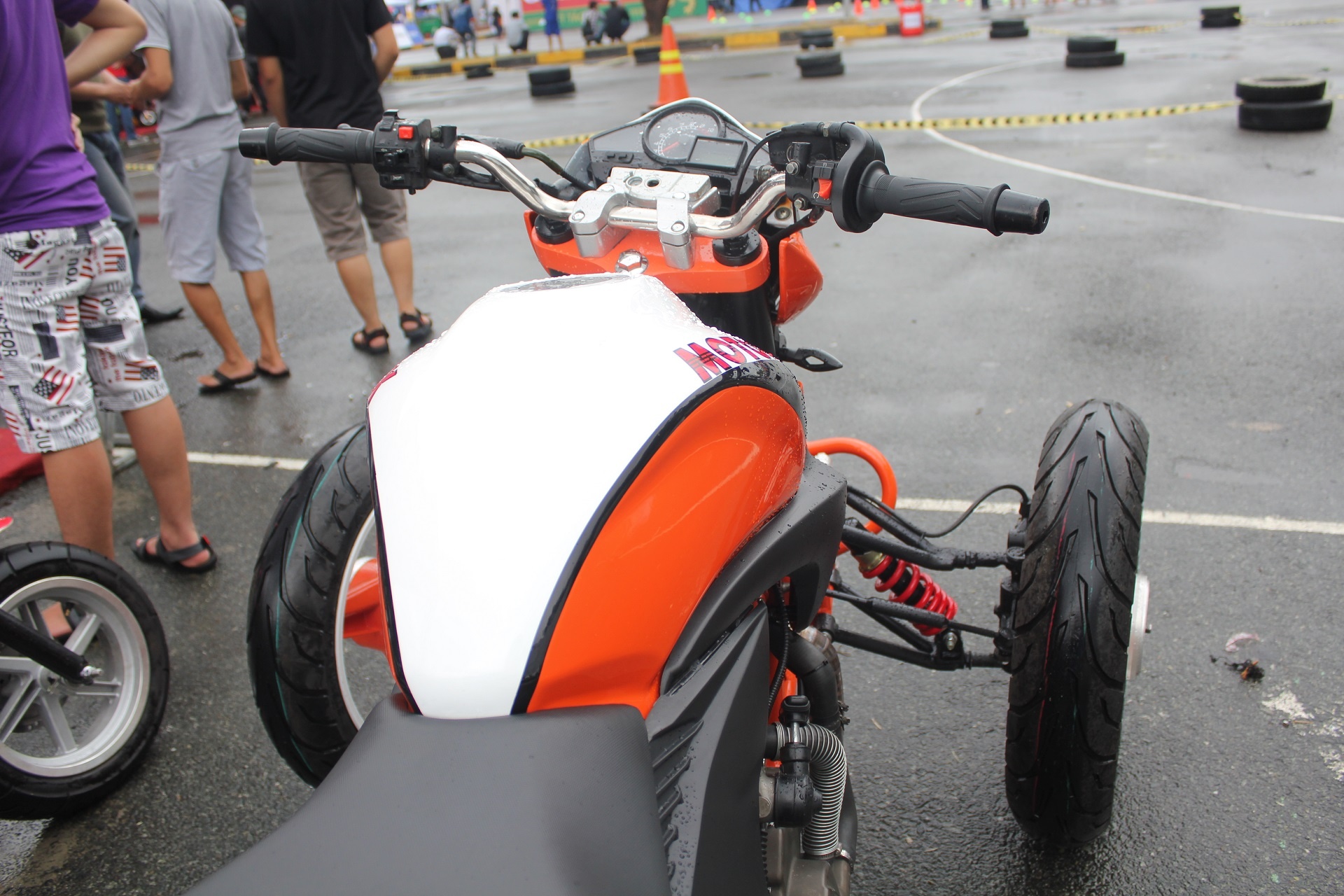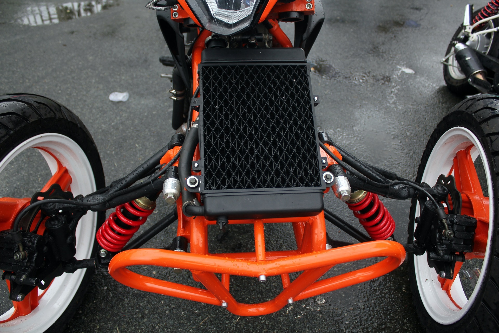 | Xe được biến đổi hoàn toàn phần đầu. Từ một chiếc naked-bike của Honda, nó trở thành một chiếc mô tô 3 bánh mang phong cách KTM bởi màu sơn cam-trắng đặc trưng của hãng này. |