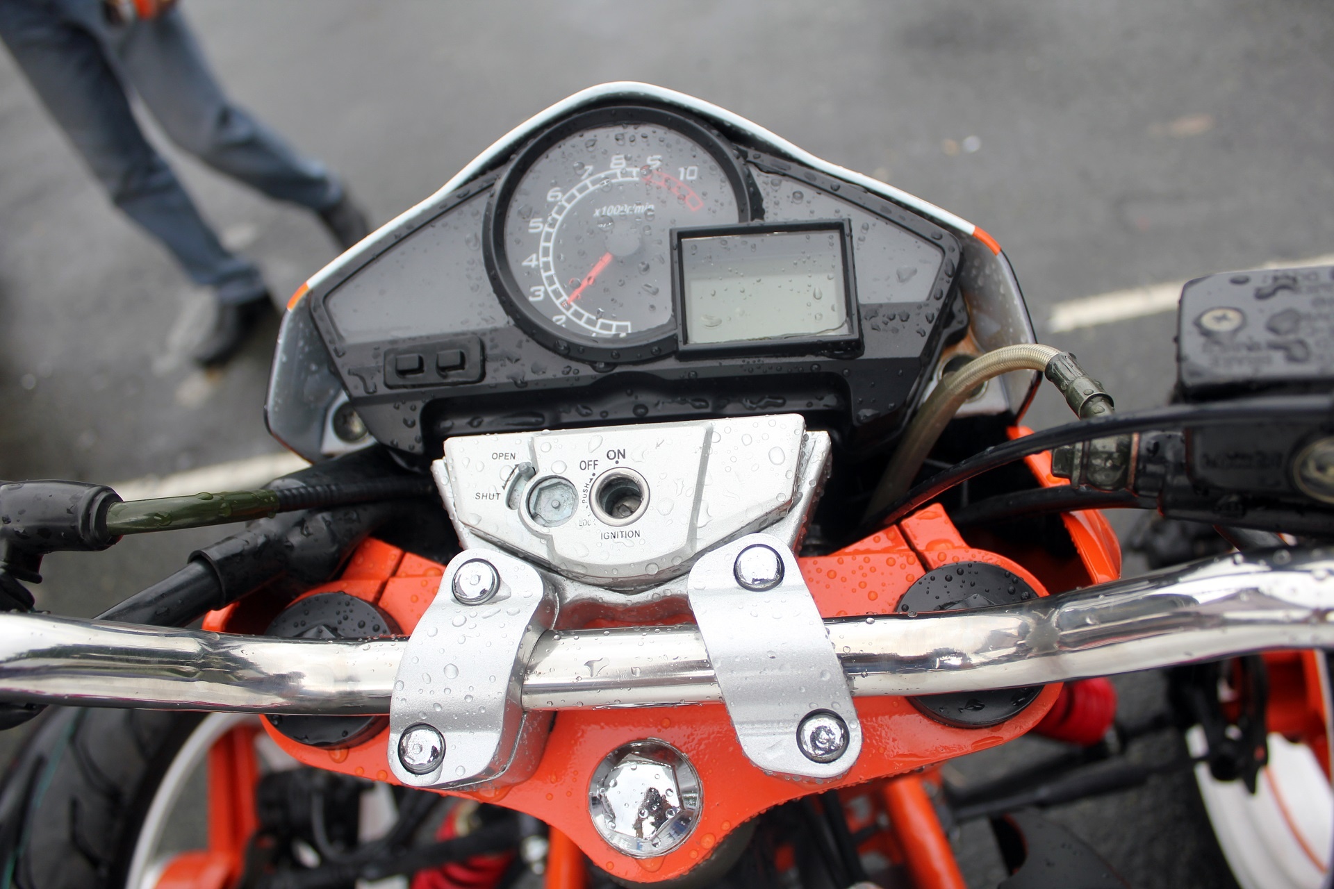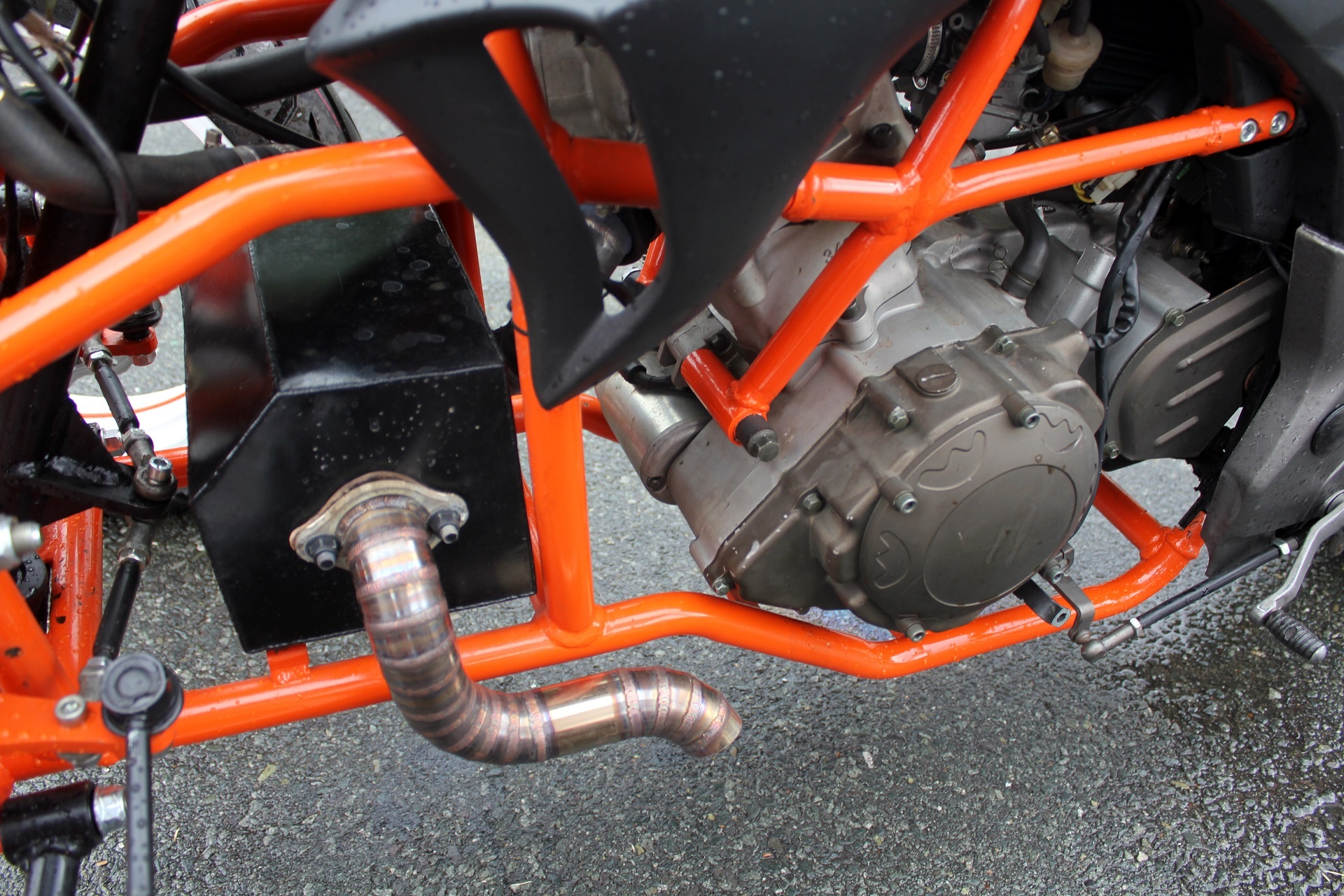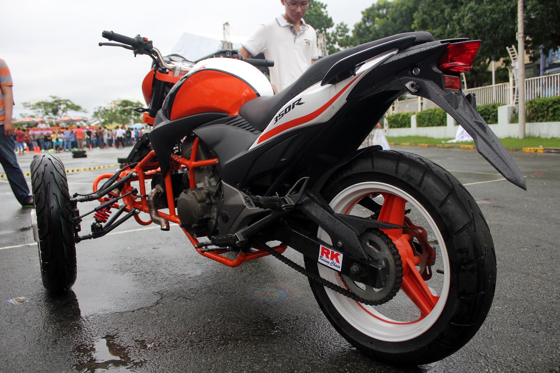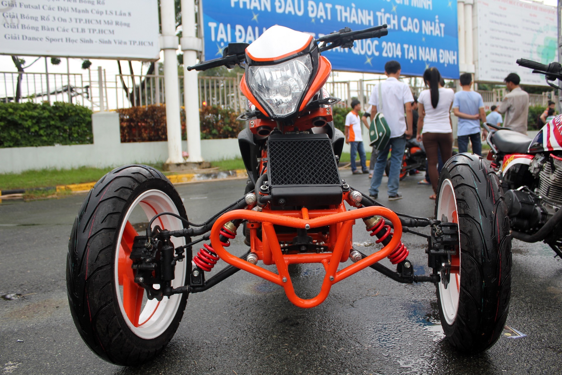| Xe được biến đổi hoàn toàn phần đầu. Từ một chiếc naked-bike của Honda, nó trở thành một chiếc mô tô 3 bánh mang phong cách KTM bởi màu sơn cam-trắng đặc trưng của hãng này. |