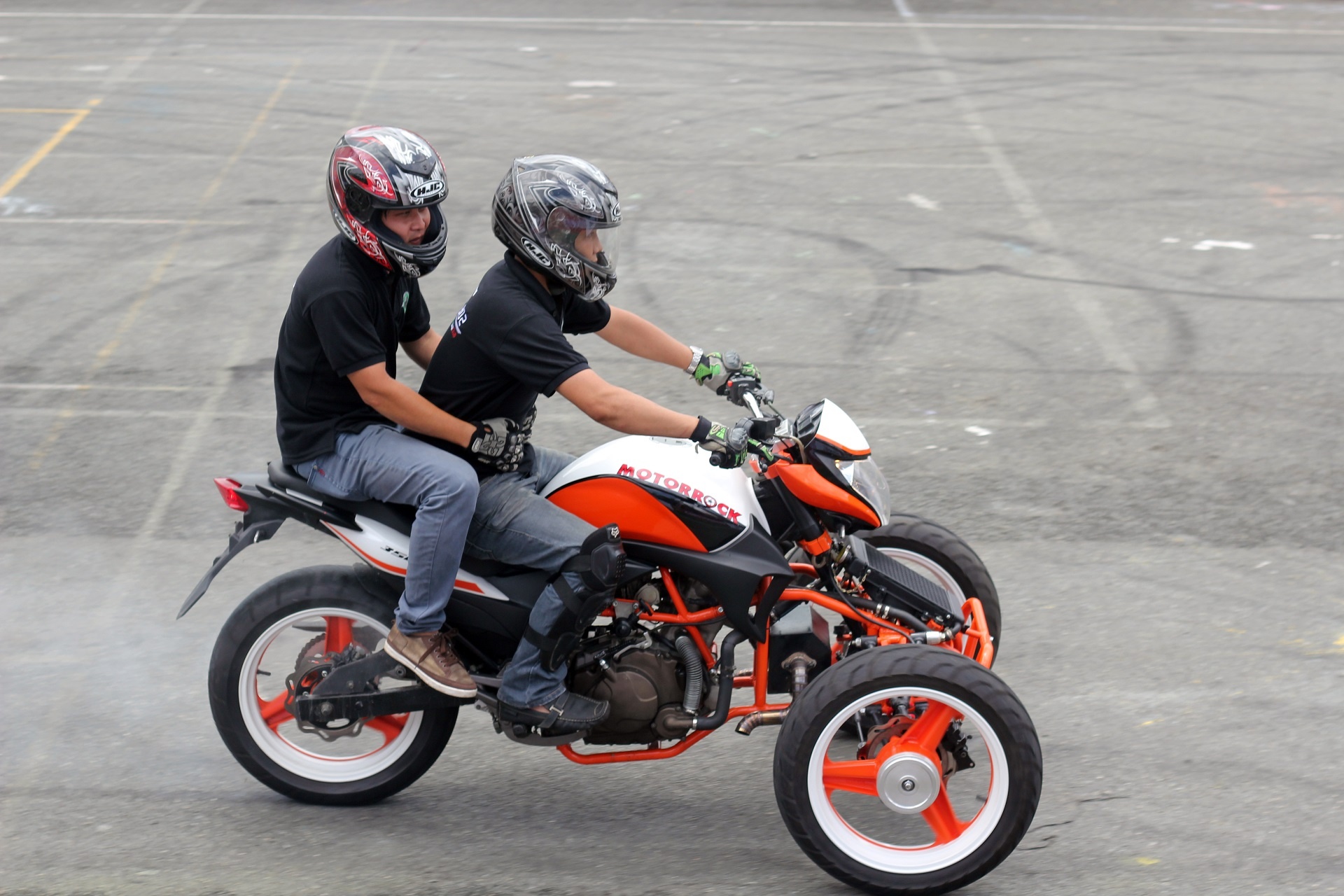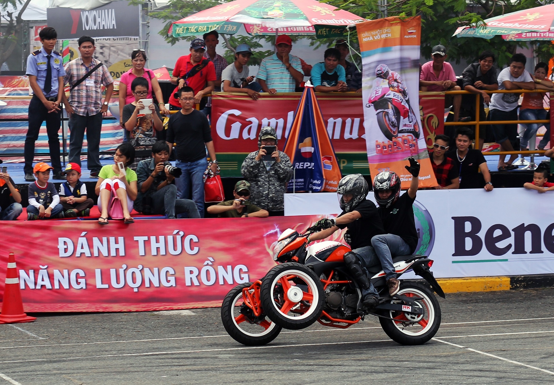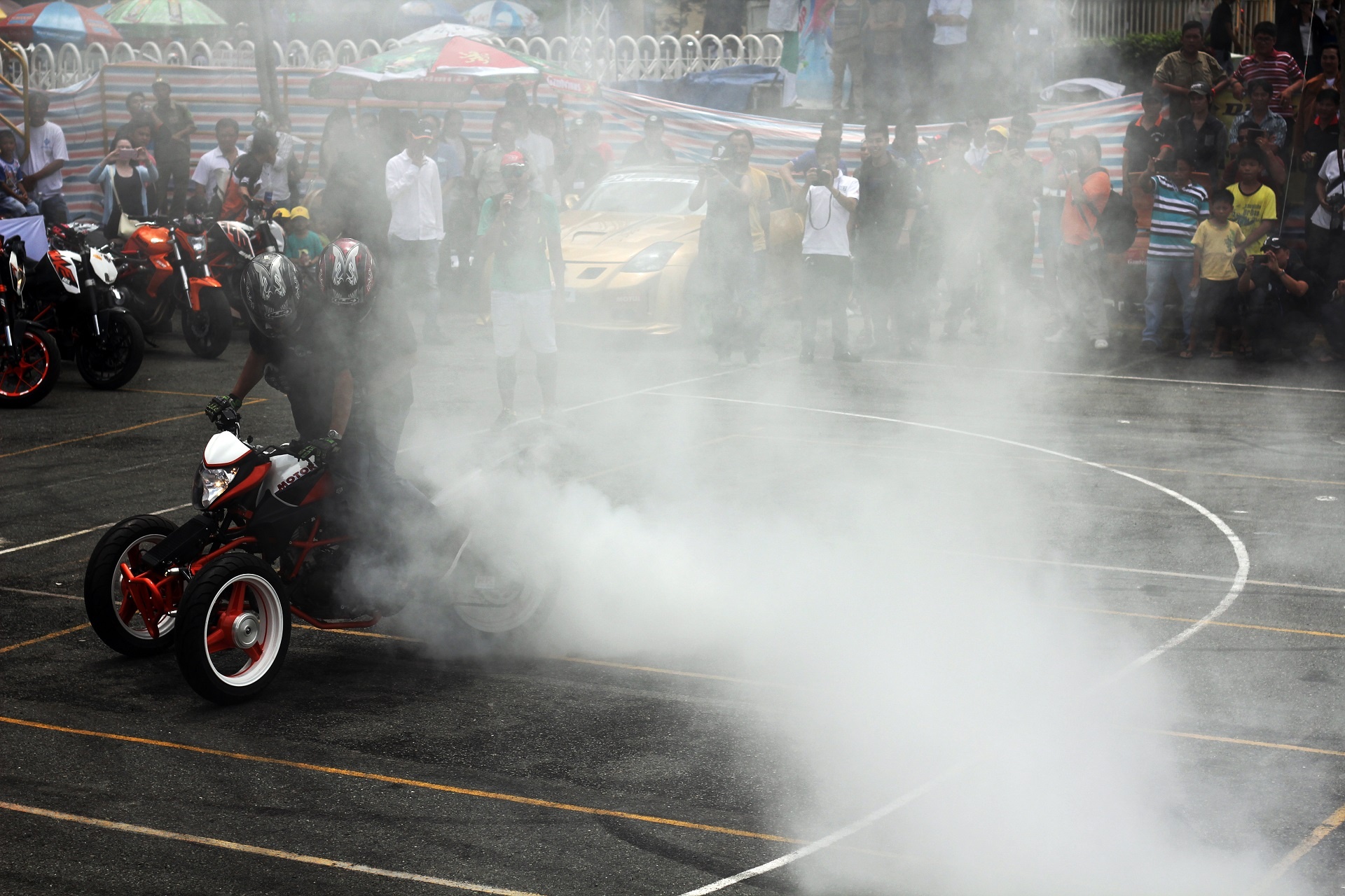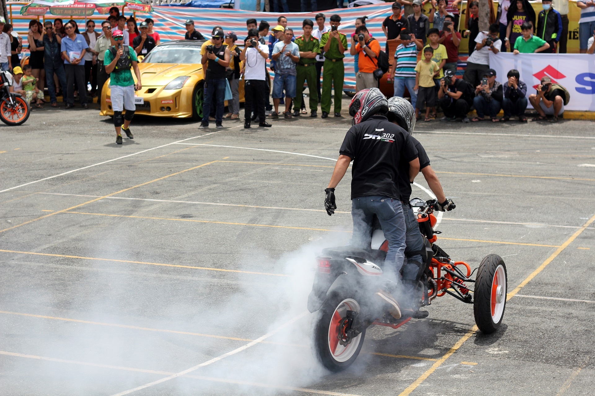 | Màn đốt lốp trong khi chở một người phía sau khiến nhiều khán giả trầm trồ. |