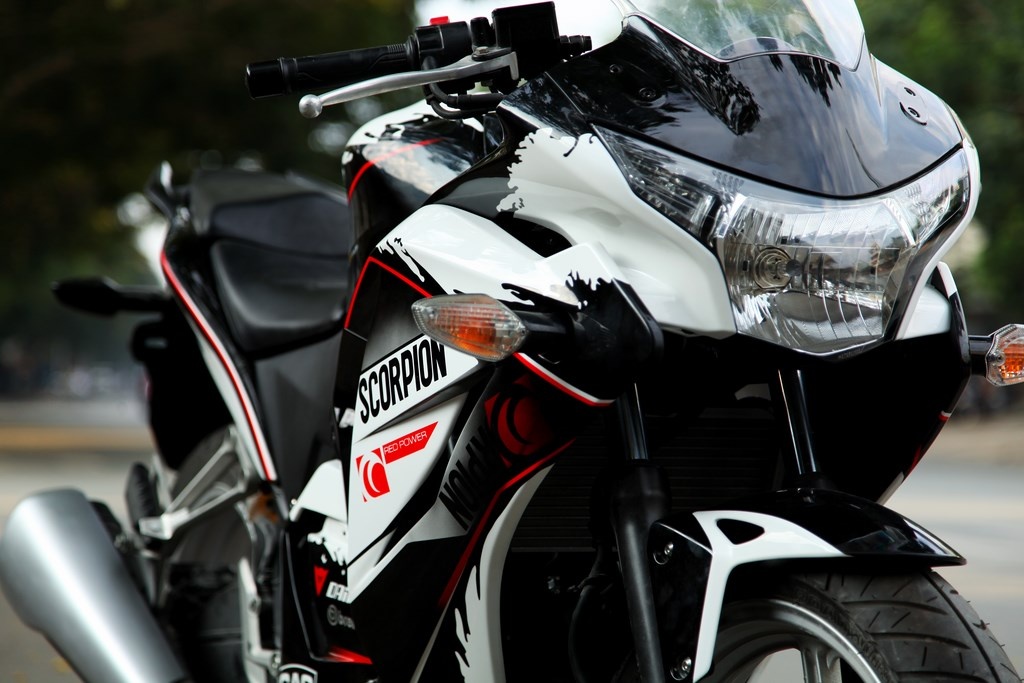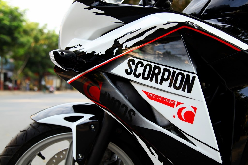 | Xe được sơn tem đấu theo ý tưởng Scorpion Red Power - tên một hãng sản xuất pô xe nổi tiếng với tông màu chủ đạo trắng - đen - đỏ. |