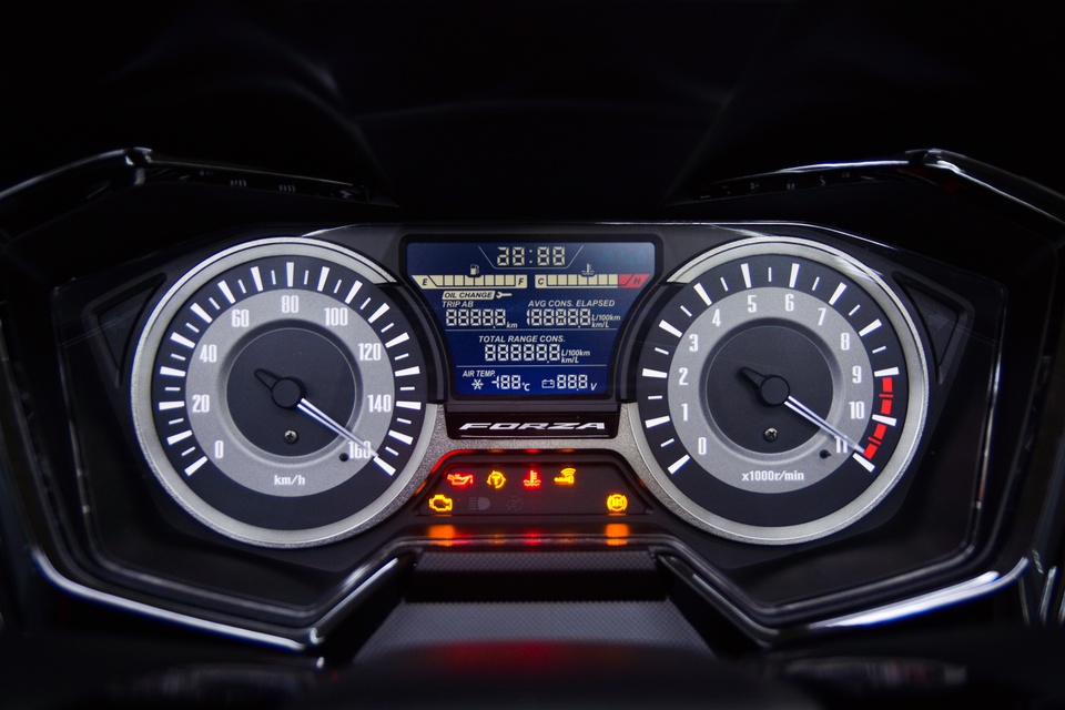 | Phần đầu xe tạo điểm nhấn với dải đèn đề-mi hình chữ V đối xứng, phía bên dưới là hệ thống đèn cốt/pha được chia thành từng hốc nhỏ góc cạnh. Toàn bộ đèn trên Forza 300 đều dùng công nghệ LED. |