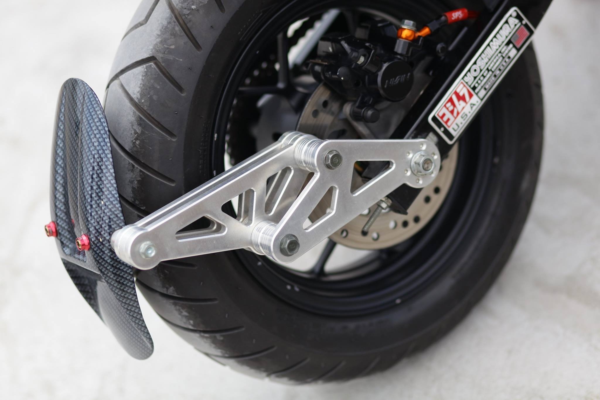 | Bánh sau gắn thêm chắn bùn với vân carbon thể thao. Thời gian hoàn thiện phiên bản độ này khoảng 5 ngày. |