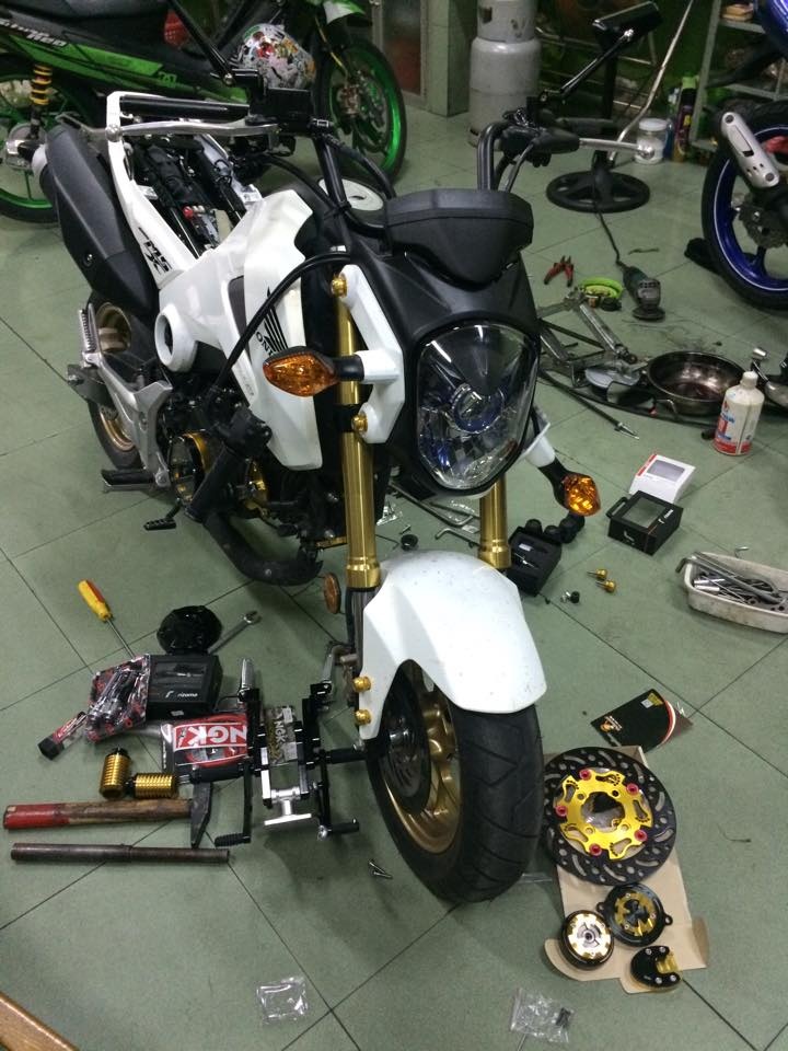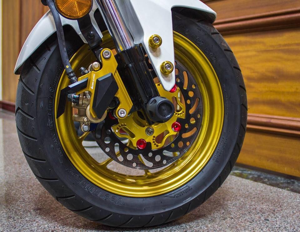 | Nhằm tăng tính an toàn và thẩm mỹ, đĩa trước được thay thế bằng thương hiệu Boushi Racing, miếng che heo dầu hiệu Biker Racing. Theo chia sẻ của người trực tiếp làm ra sản phẩm này, chiếc MSX đã được độ gần hoàn chỉnh, tuy nhiên thời gian tới sẽ tiếp tục được lên những món đồ chơi đắt tiền như phuộc Ohlins, heo dầu Brembo... Ảnh: Le Eagle. |