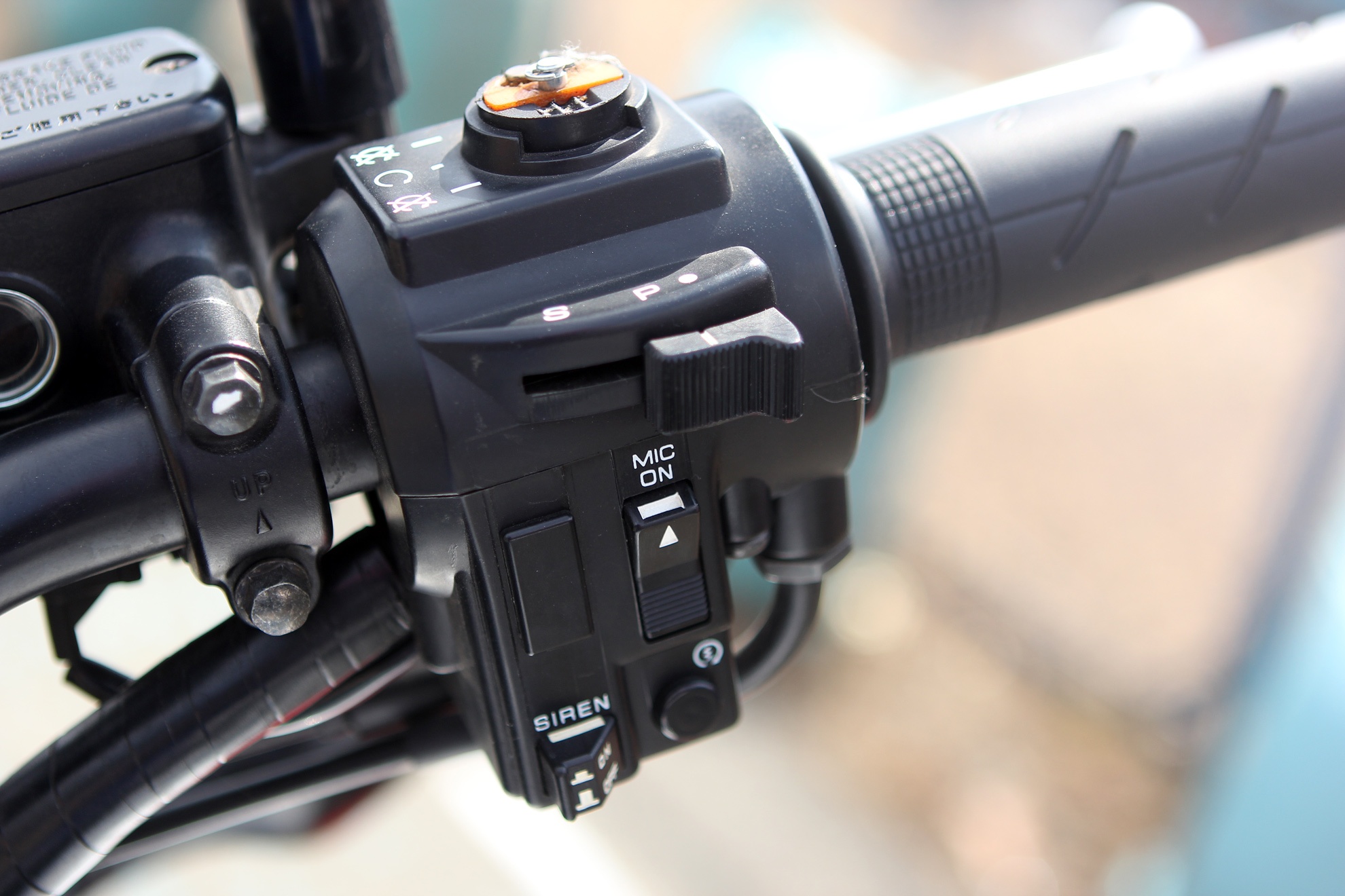 | Tay lái bên trái với các nút chuyển chế độ chiếu sáng, công tắc xi-nhan, còi hay đèn khẩn cấp. |