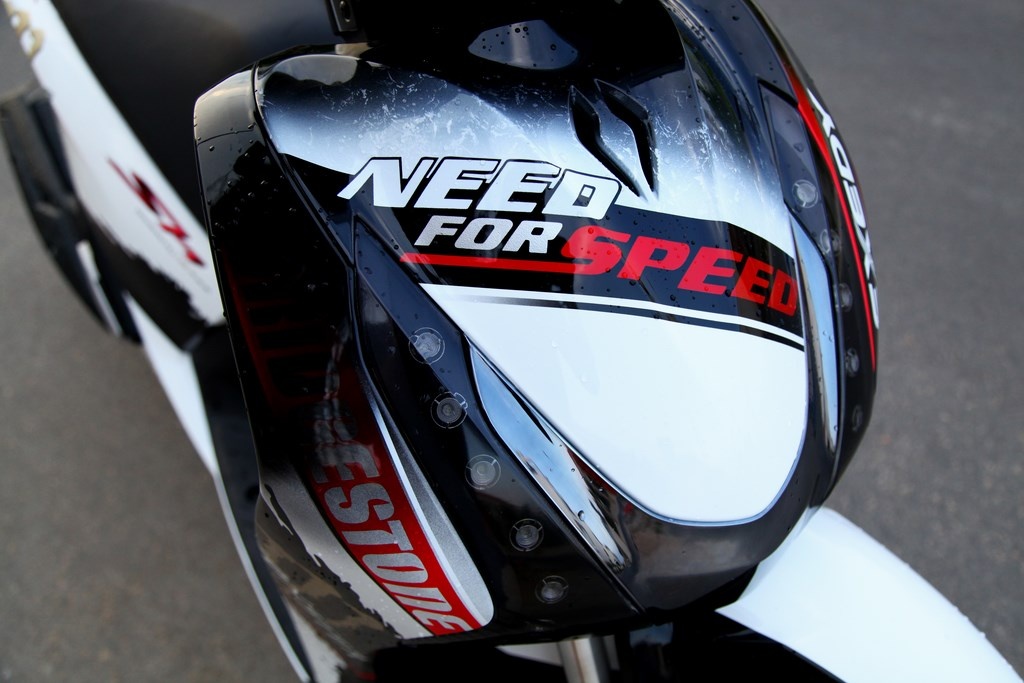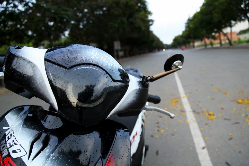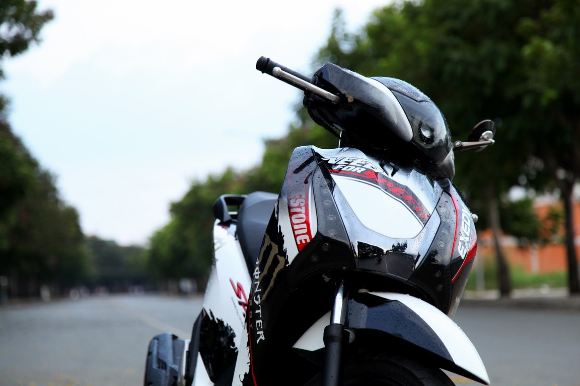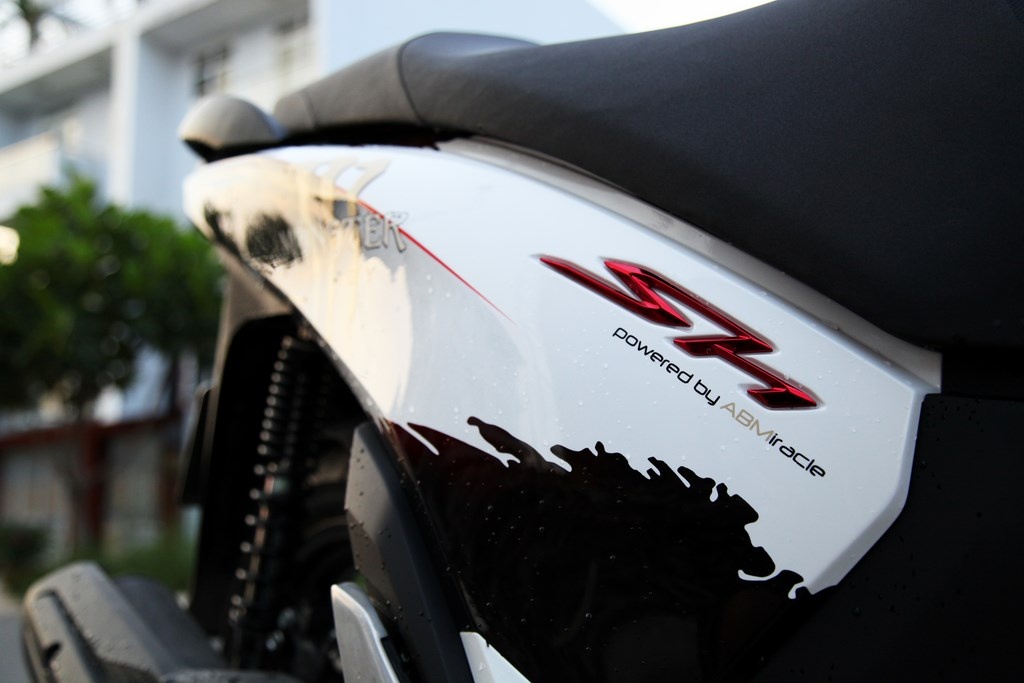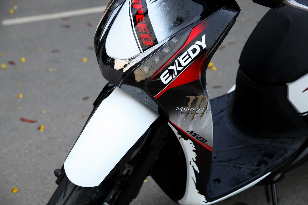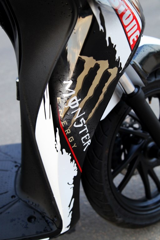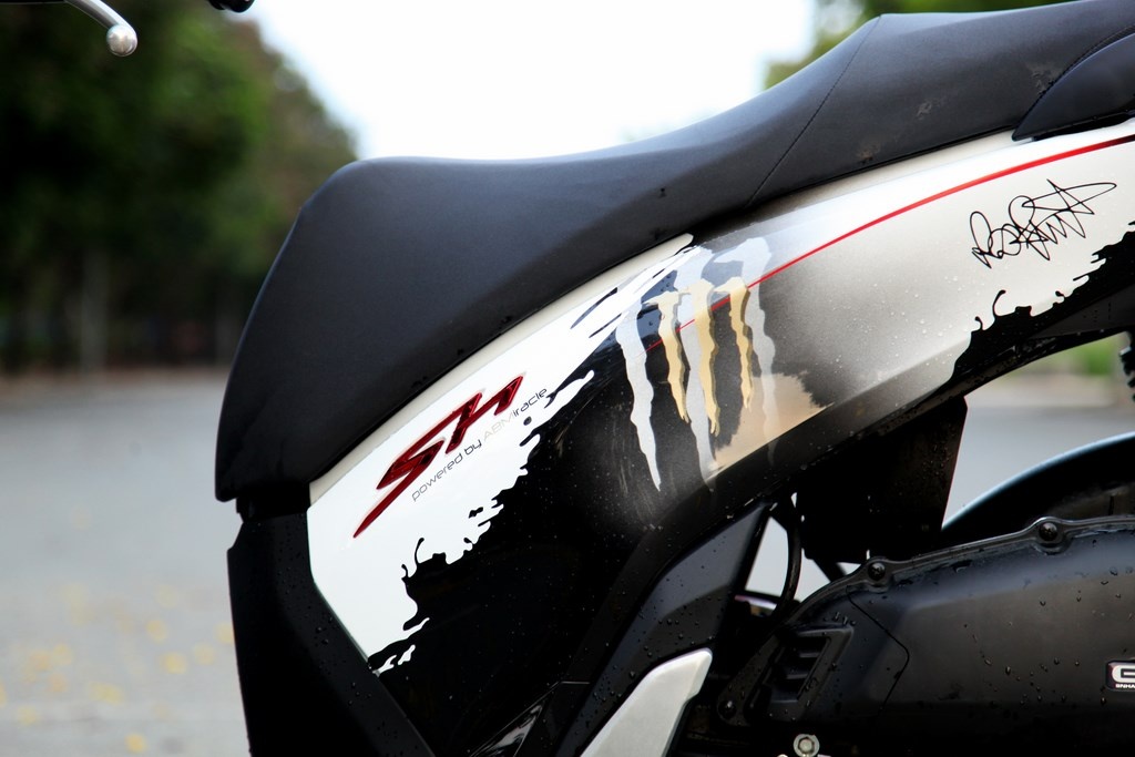 | Thân xe sơn tem đấu airbrush theo ý tưởng Monster với tông màu chủ đạo trắng - đen - đỏ và nhấn bằng màu đồng, tạo phong cách thanh lịch, tinh tế mà vẫn trẻ trung. |
